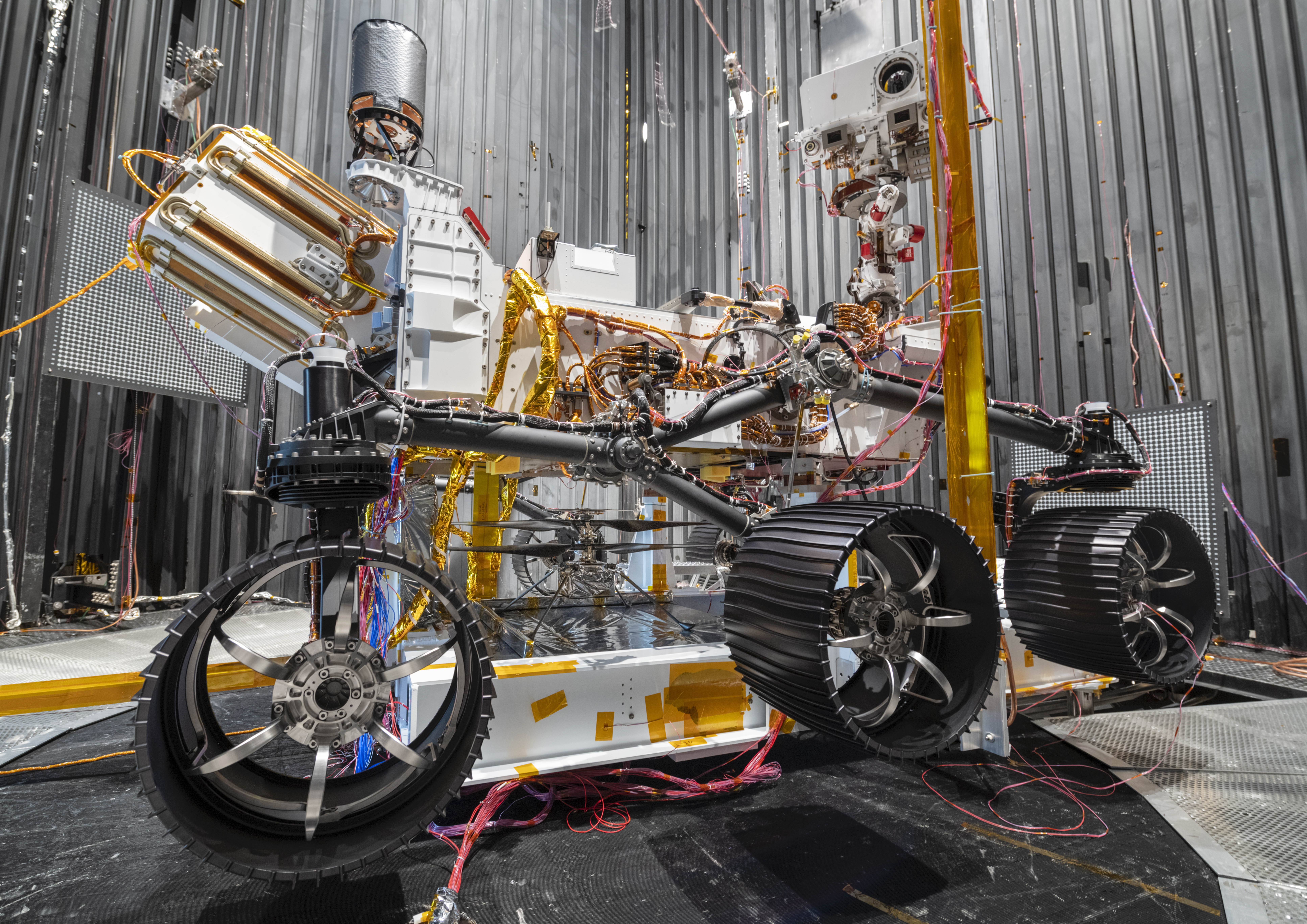 In this photo taken on Oct. 1, 2019, the Mars 2020 Perseverance rover and the Ingenuity Mars Helicopter (between left and center rover wheels) have just completed a multiweek evaluation under Mars-like conditions inside a 25-foot-wide, 85-foot-tall (8-meter-by-26-meter) vacuum chamber at NASA's Jet Propulsion Laboratory in Southern California. It marks the first time that Ingenuity was deployed in a flight-like manner from the belly of Perseverance, utilizing all the actuators (motors) and pyrotechnics that will be required to release the rotorcraft from the rover's belly and place it safely on the surface of Mars.