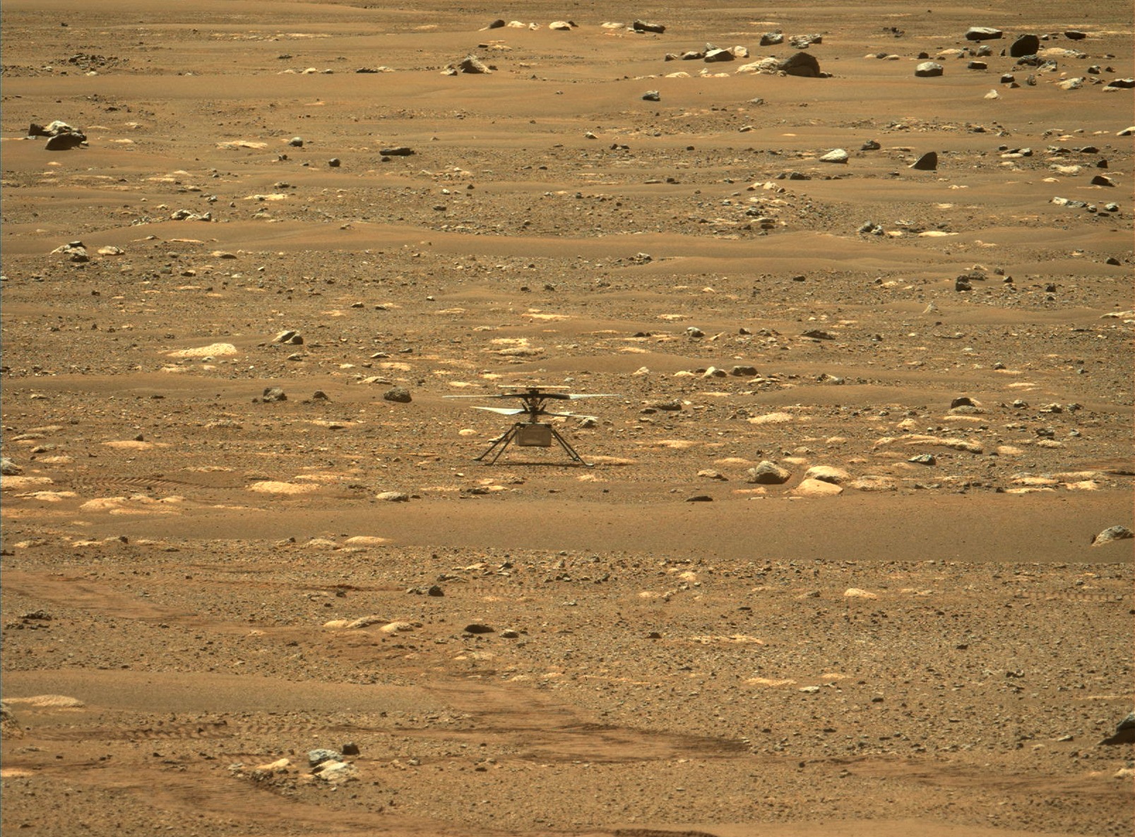 This image from NASA’s Perseverance rover shows the agency’s Ingenuity Mars Helicopter right after it successfully completed a high-speed spin-up test. It was captured by the Mastcam-Z instrument on Perseverance on April 16, 2021 (the 55th sol, or Martian day, of the rover’s mission). The image has been slightly processed (stretched and cropped).