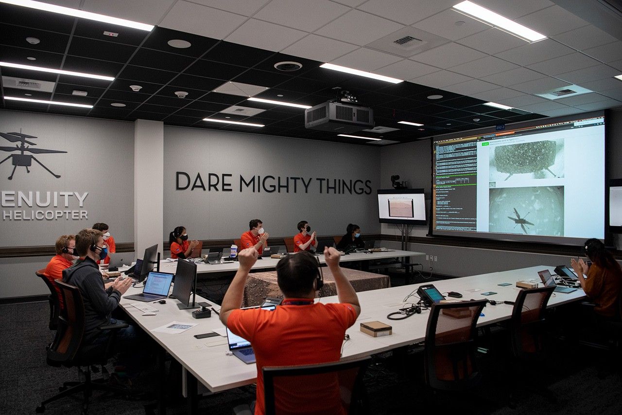 Members of NASA’s Ingenuity Mars Helicopter team at the agency’s Jet Propulsion Laboratory react to data showing that the helicopter completed its second flight on the Red Planet on April 22, 2021.