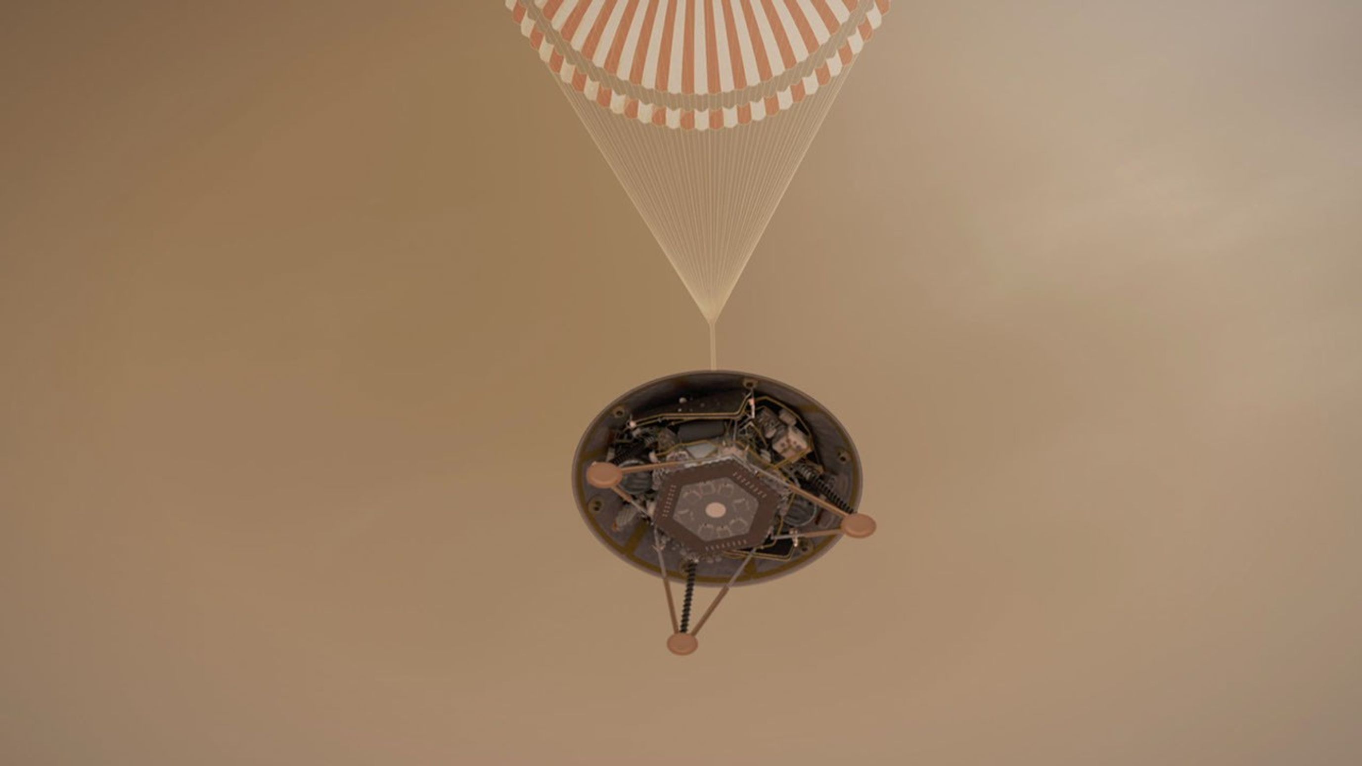 This illustration shows a simulated view of NASA's InSight lander descending towards the surface of Mars on its parachute.