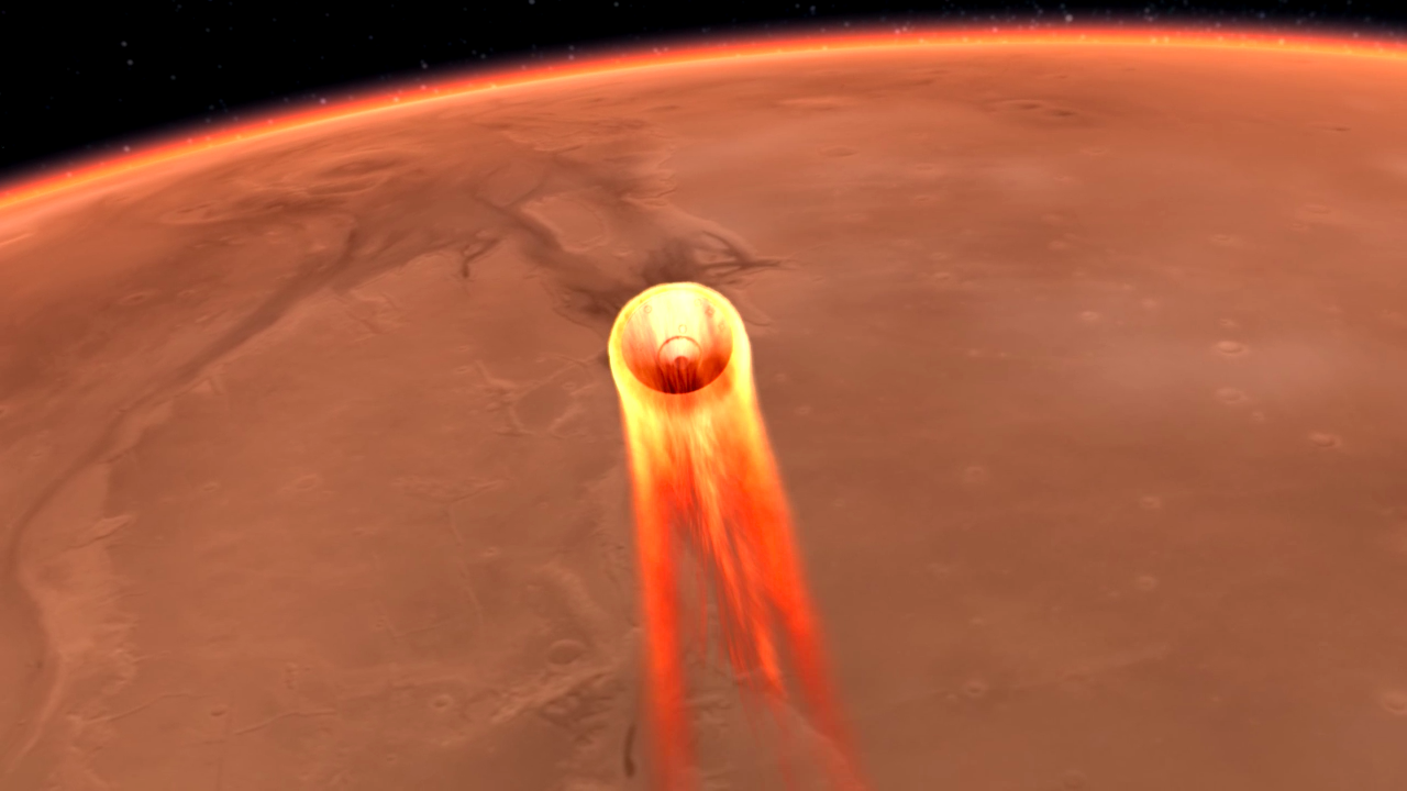 Entry, descent, and landing (EDL) begins when the spacecraft reaches the Martian atmosphere, about 80 miles (about 128 kilometers) above the surface, and ends with the lander safe and sound on the surface of Mars six minutes later.