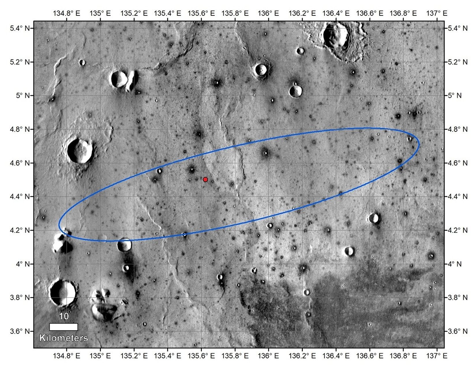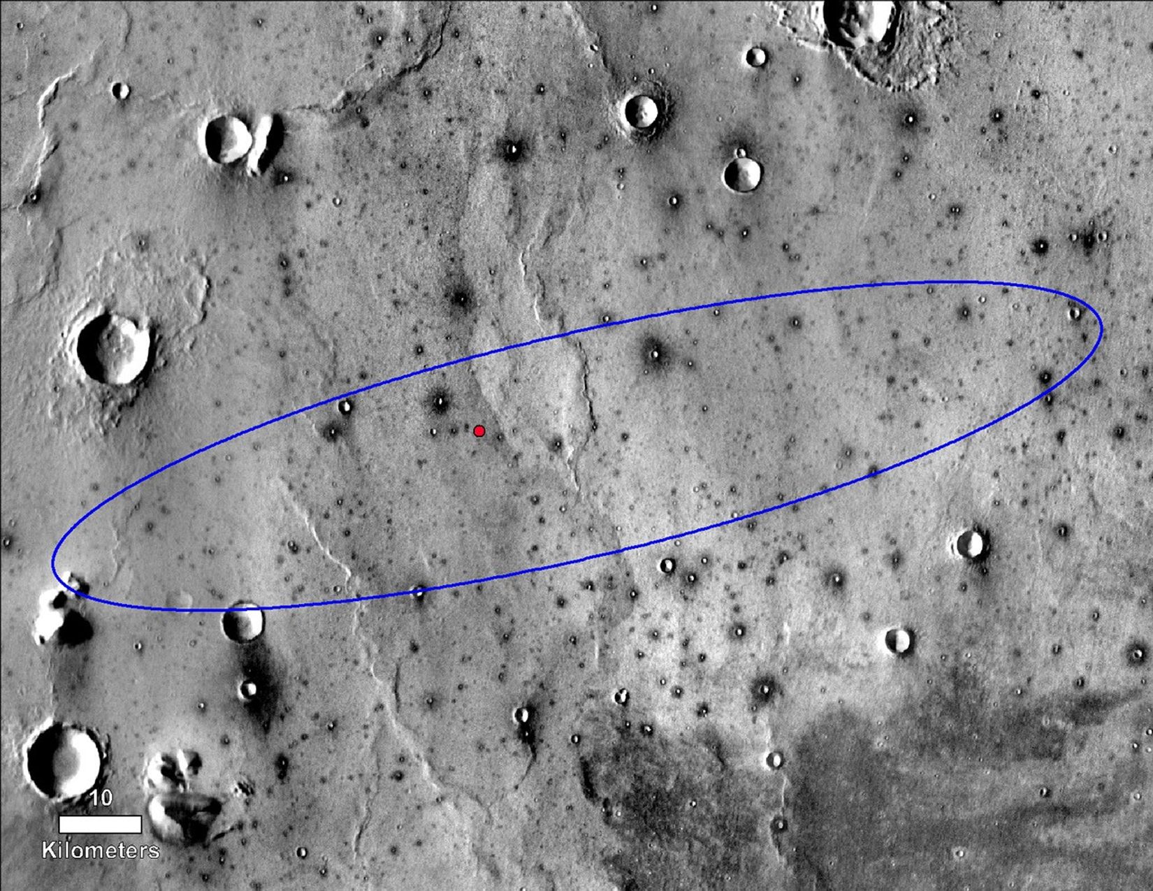 The landing ellipse on this map covers an area within which the spacecraft had about a 99 percent chance of landing when targeted for the center of the ellipse. It is about 81 miles (130 kilometers) long, generally west to east, and about 17 miles (27 kilometers) wide.
