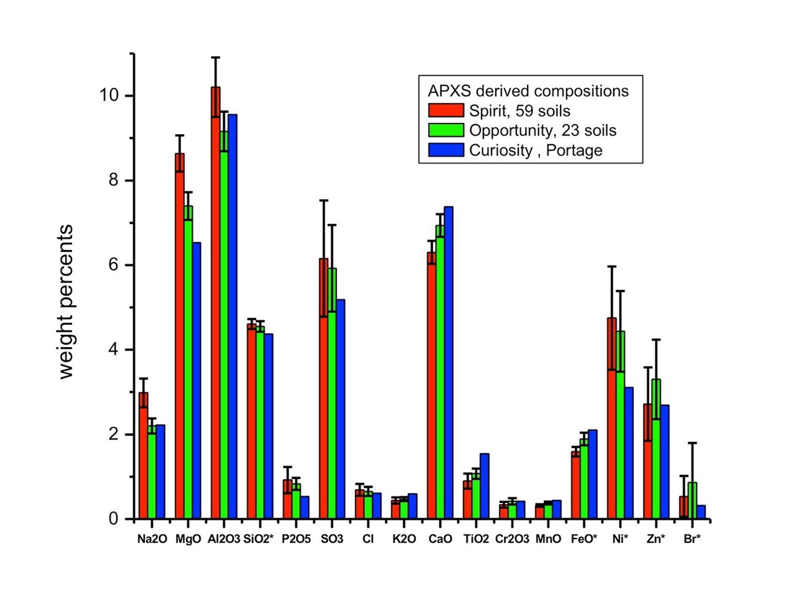 This graph compares the elemental composition of typical soils at three landing regions on Mars: Gusev Crater, where NASA's Mars Exploration Rover Spirit traveled; Meridiani Planum, where Mars Exploration Rover Opportunity still roams; and now Gale Crater, where NASA's newest Curiosity rover is currently investigating. The data from the Mars Exploration Rovers are from several batches of soil, while the Curiosity data are from soil taken inside a wheel scuff mark called "Portage" and examined with its Alpha Particle X-ray Spectrometer (APXS).