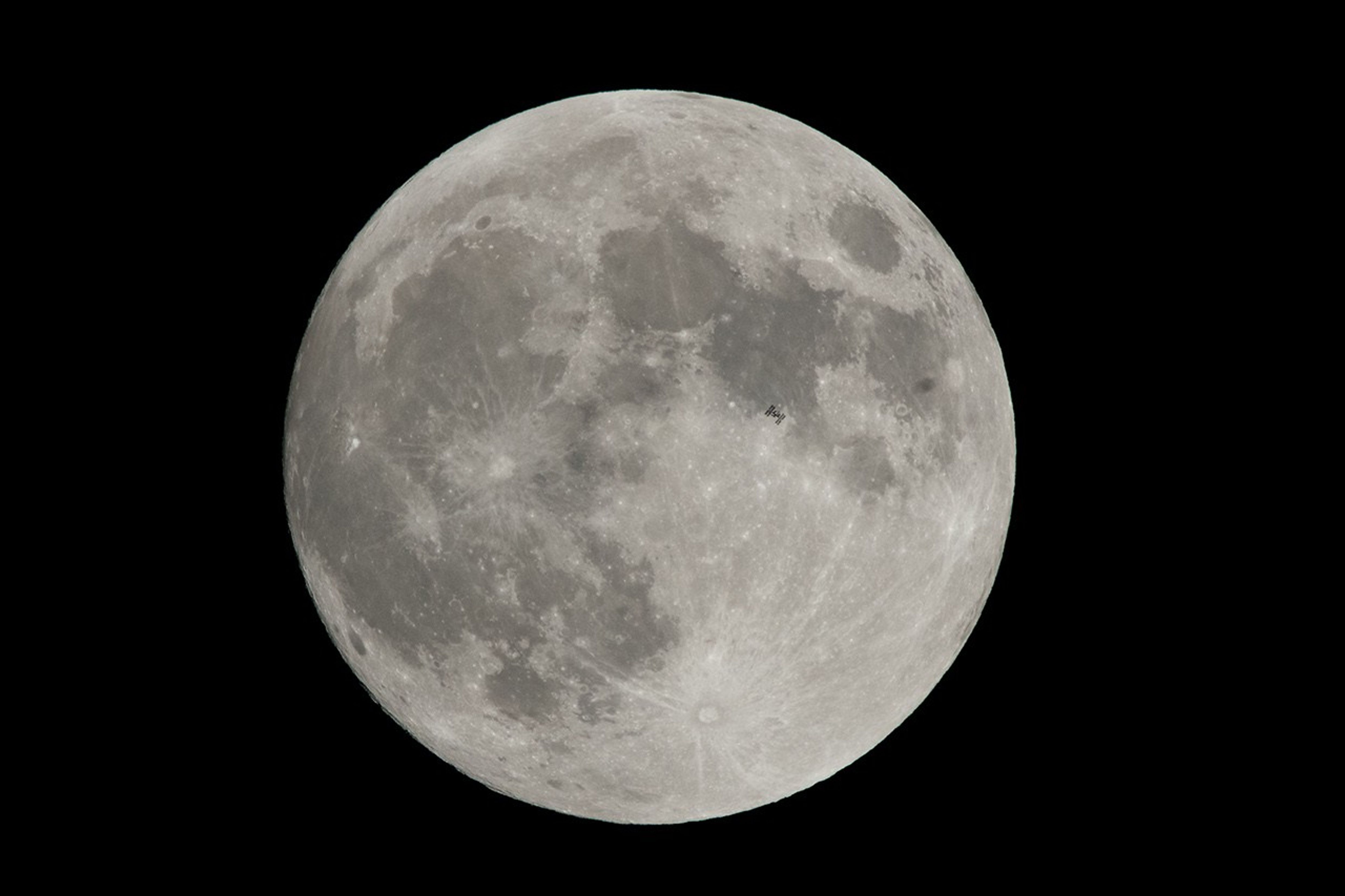 The International Space Station, with a crew of six onboard, is seen in silhouette as it transits the Moon at roughly five miles per second Tuesday, Jan. 30, 2018, from Alexandria, Virginia.