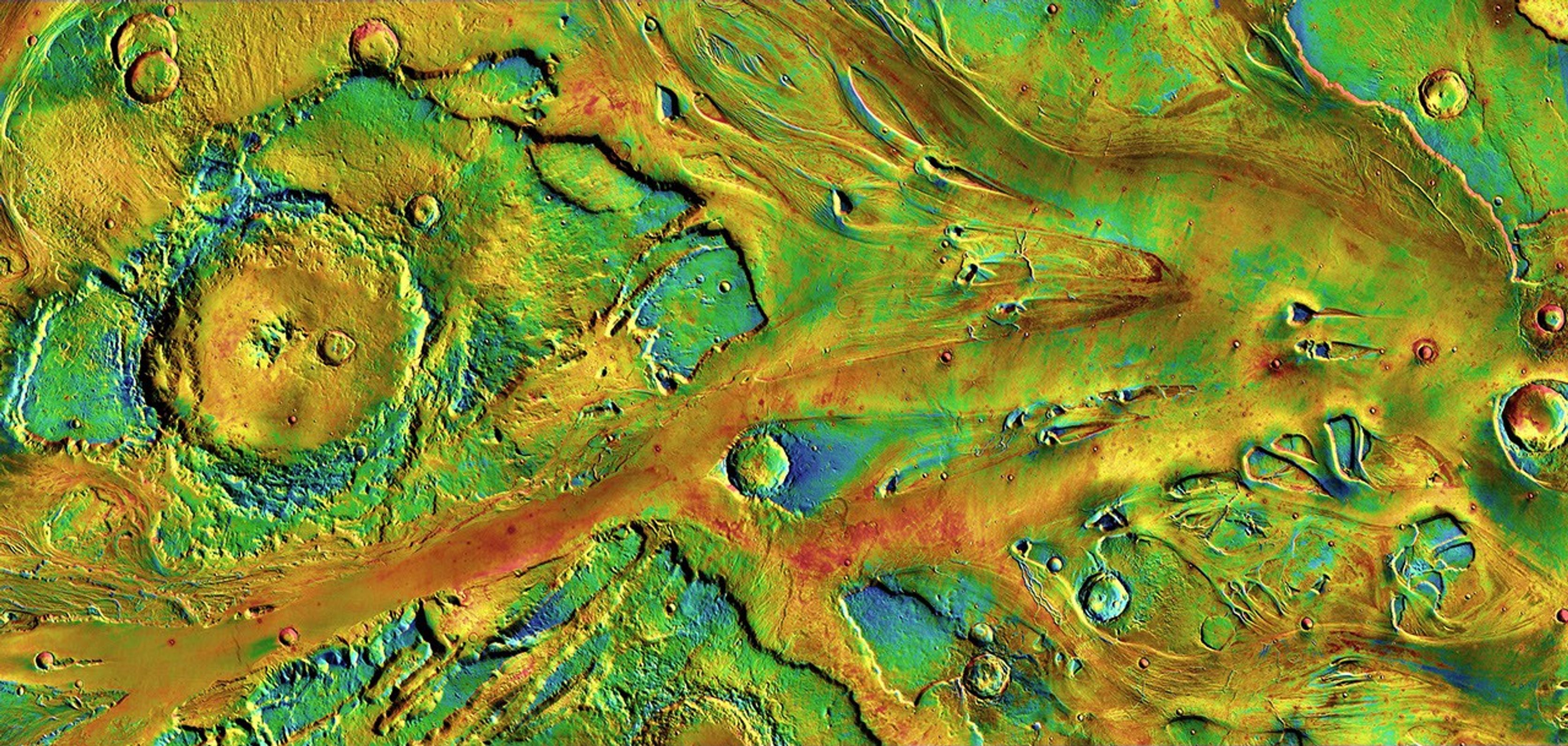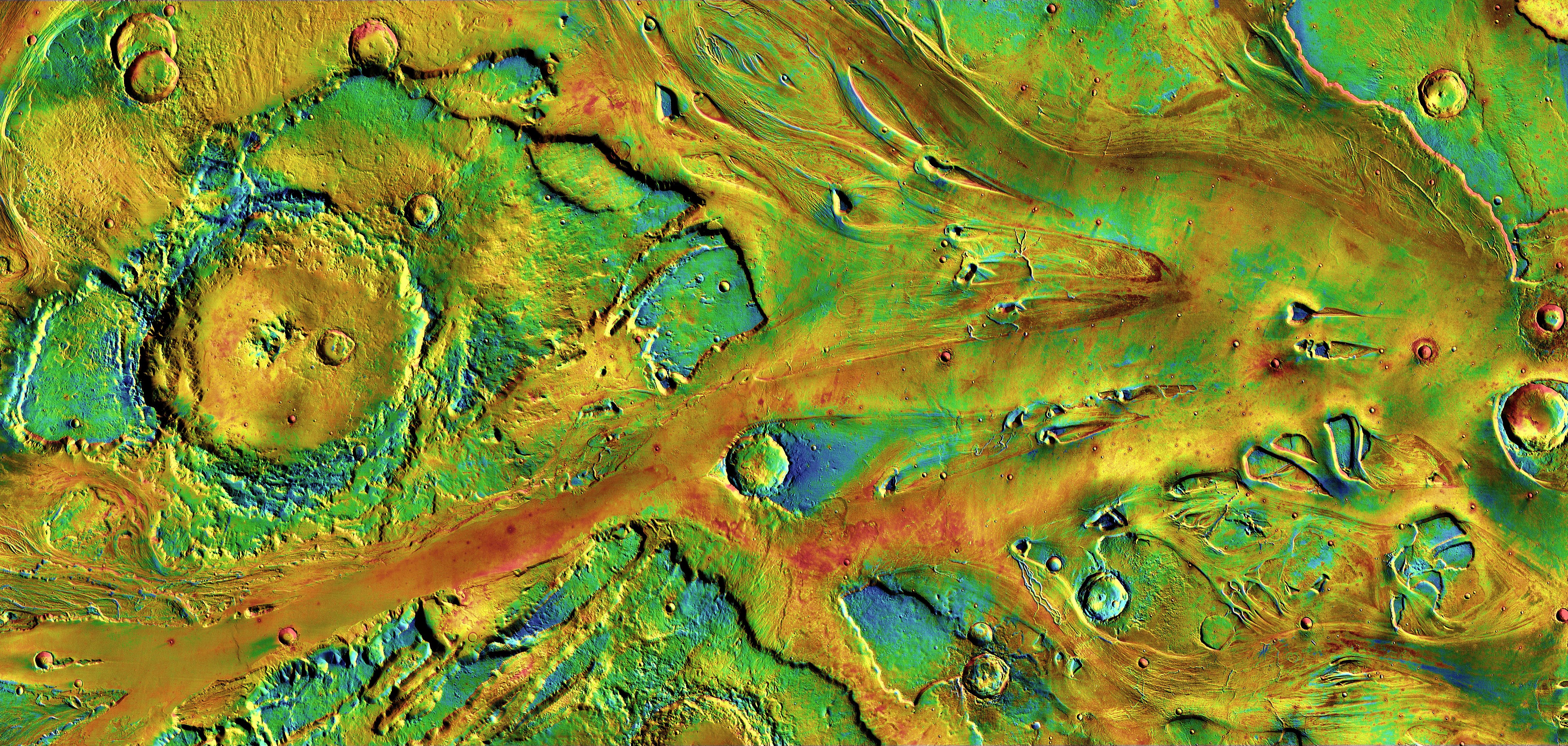 Billions of years ago, floodwaters emerged from Echus Chasma on the northern side of Valles Marineris, the "Grand Canyon" of Mars. The waters then poured across the landscape as they headed for the northern lowlands, carving a giant channel named Kasei Valles. In the scene here, the floodwaters moved generally left to right, dividing and merging to erode a network of linked channels. Where the floods encountered hills and craters in their path, they often left a streamlined mesa behind the feature, pointing like a pennant downstream. False colors display the nature of the ground surface. Areas in cool tints have more fine-grain materials (such as sand and dust) at the surface, while redder tints indicate areas with harder sediments and outcrops of rock.