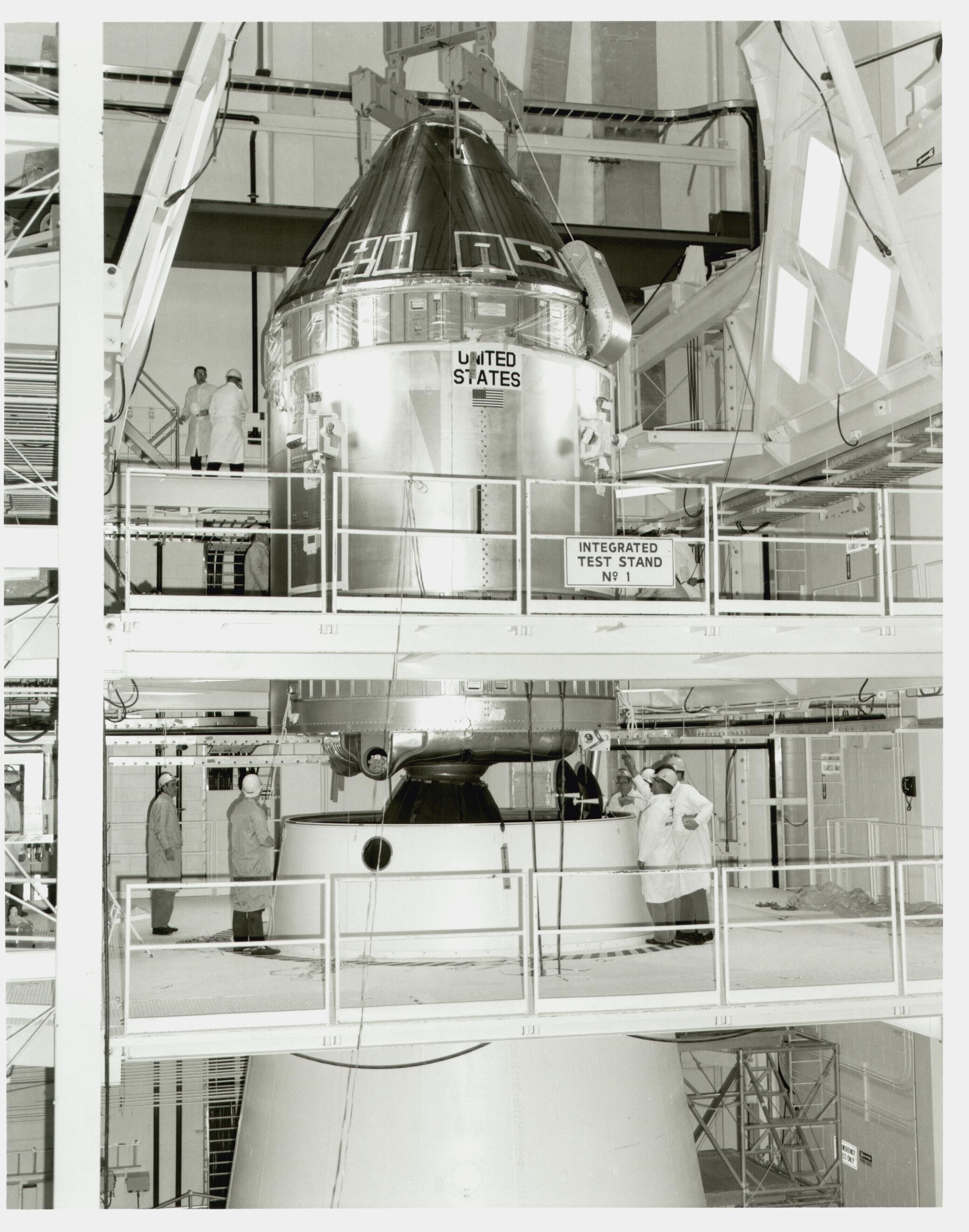 Apollo 11 Command and Service Module, taking up multiple scaffolded floors of an indoor facility, with people working on the upper two floors