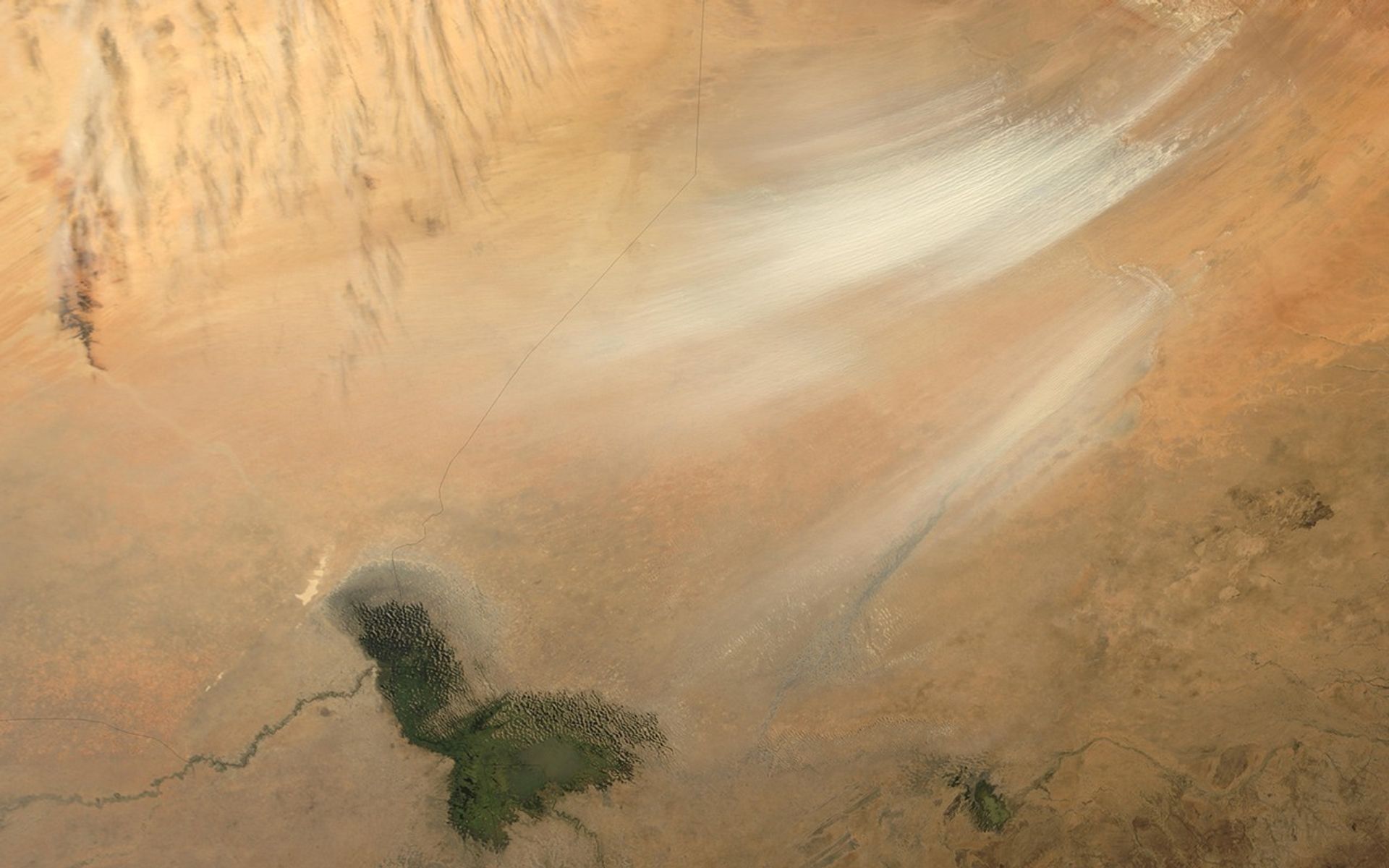 The remnants of Lake Chad appear in olive-green amid the tan and light brown hues of the surrounding landscape where the countries of Chad, Niger, Nigeria and Cameroon all share borders. The Bodele Depression was the source of some very impressive dust storms that swept over West Africa and the Cape Verde Islands in February 2004, the date of this image.