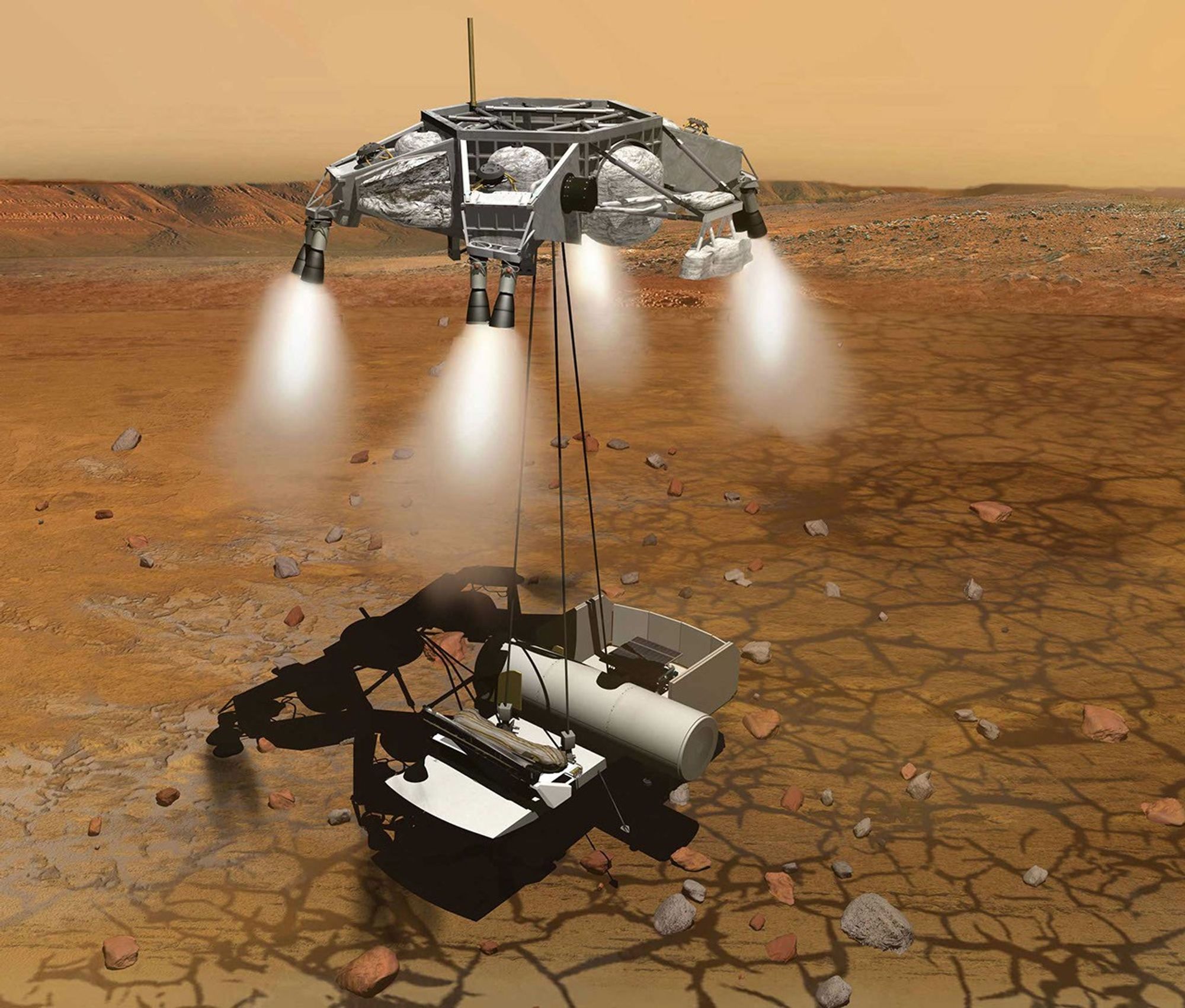 This artist's concept of a proposed Mars sample return mission portrays a rocket-powered descent stage lowering a sample-retrieving rover and an ascent vehicle to the surface. The ascent vehicle is in the large cylinder, protecting it from the harsh Martian environment. The rover, with solar-panels in folded position, sits to the right of it. The ascent vehicle would receive samples of Martian rocks that are to be collected by a previous mission and retrieved by the rover. Then it would launch the samples into Martian orbit for a rendezvous with a spacecraft that would carry them to Earth.