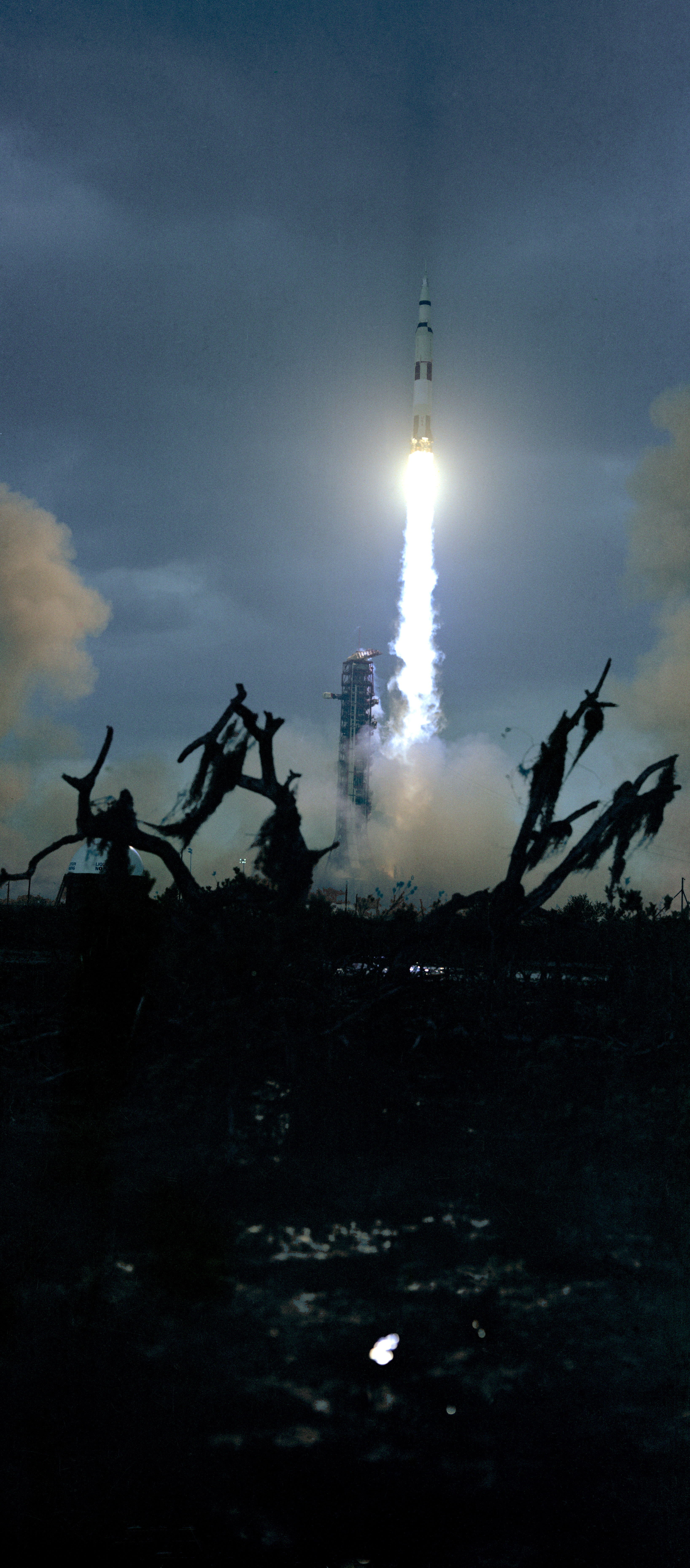 The huge, 363-feet tall Apollo 14 (Spacecraft 110/Lunar Module 8/Saturn 509) space vehicle is launched from Pad A, Launch Complex 39, Kennedy Space Center (KSC), Florida at 4:03:02 p.m. (EST), Jan. 31, 1971, on a lunar landing mission. This view is framed by moss-covered dead trees in the dark foreground. Aboard the Apollo 14 spacecraft were astronauts Alan B. Shepard Jr., commander; Stuart A. Roosa, command module pilot; and Edgar D. Mitchell, lunar module pilot.