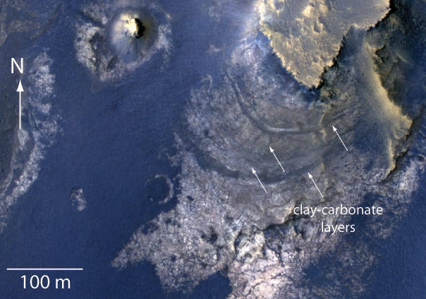 A combination of clues suggests this 1.4-mile-deep (2.2-kilometer-deep) crater once held a lake fed by groundwater. Part of the evidence is identification of clay and carbonate minerals within layers visible near the center of this image. The mineral identifications come from the Compact Reconnaissance Imaging Spectrometer for Mars (CRISM), also on the Mars Reconnaissance Orbiter.
