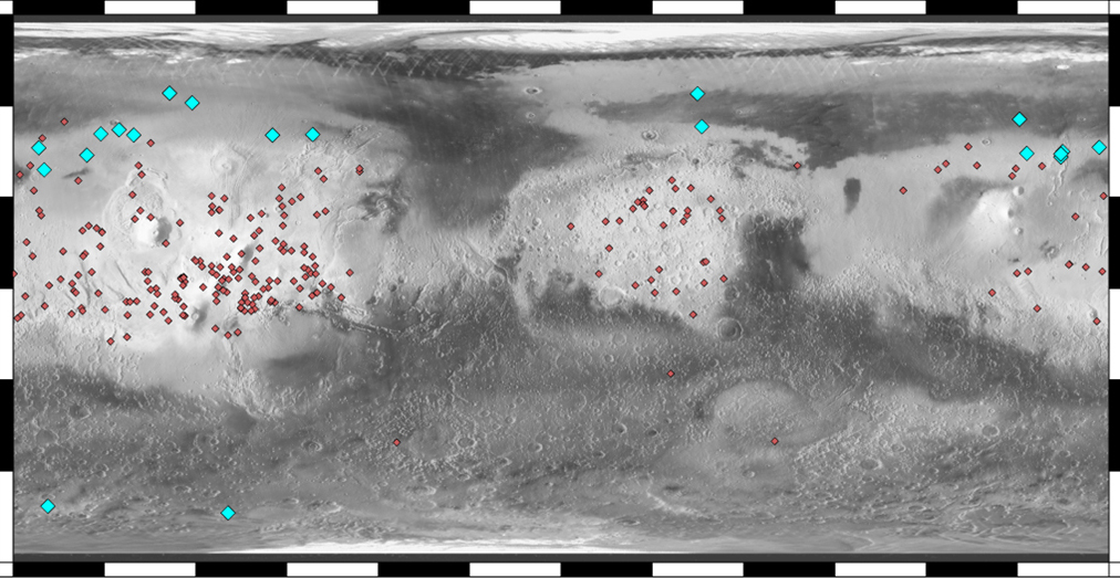 This map of Mars indicates locations of new craters that have excavated ice (blue) and those that have not (red). The underlying map is based on the brightness, or albedo, of the Martian surface. Most fresh craters are discovered in the brighter, dusty regions of Mars where dark blast patterns from the impacts can be seen.