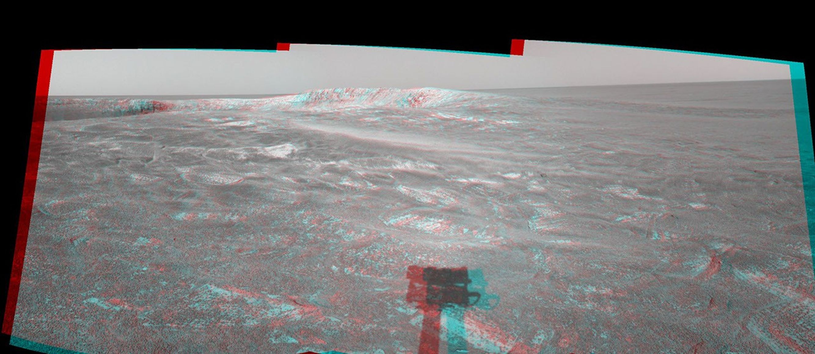 This three-dimensional anaglyph stereo view was created from navigation camera frames that NASA's Mars Exploration Rover Opportunity acquired at about 4:05 p.m., local solar time on Mars, on sol 108, May 13, 2004. It is presented in a cylindrical-perspective projection. Opportunity is sitting along the rim of "Endurance Crater." NASA has not yet determined whether Opportunity will venture inside the crater, which is about 130 meters (about 430 feet) in diameter.