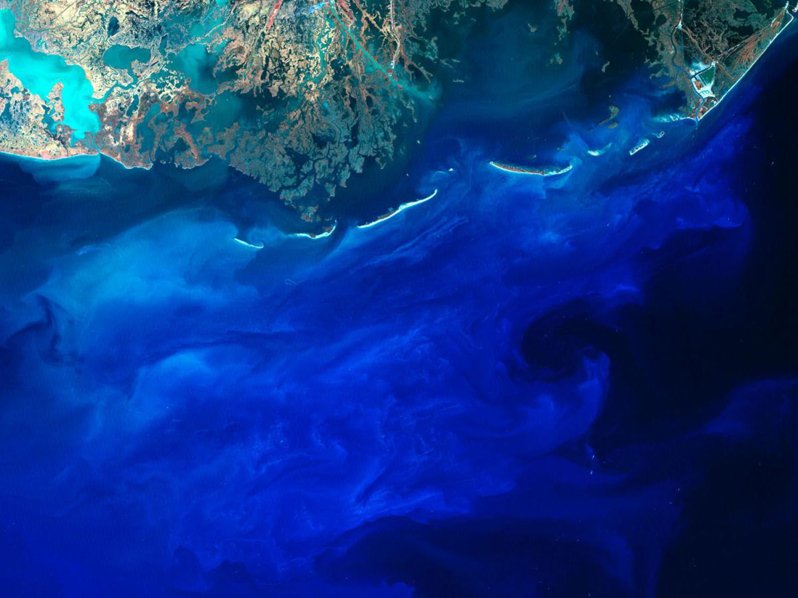 In this image, we see blue silt off the southern coast of Louisiana as the Mississippi River flows off into the Gulf of Mexico. The brightness and shade of blue depends on the density of the silt and the depth of the silt-carrying currents in the water. The small bright dots in the scene are fishing boats and oil platforms.