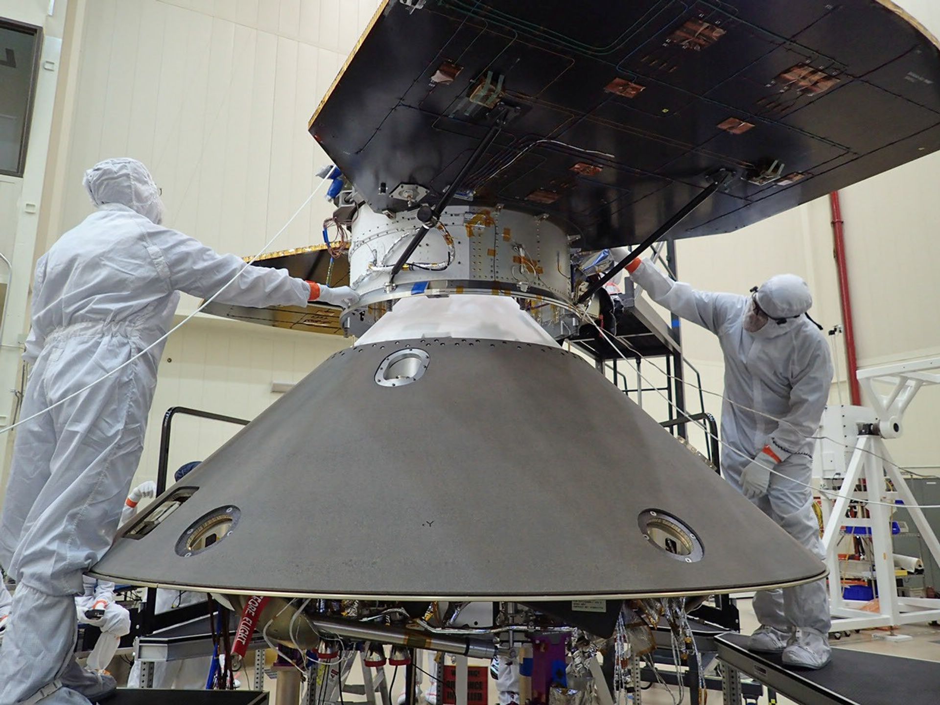 Spacecraft specialists at Lockheed Martin Space Systems, Denver, are preparing to attach the cruise stage of NASA's InSight spacecraft to the top of the spacecraft's back shell in this April 29, 2015, photo.
