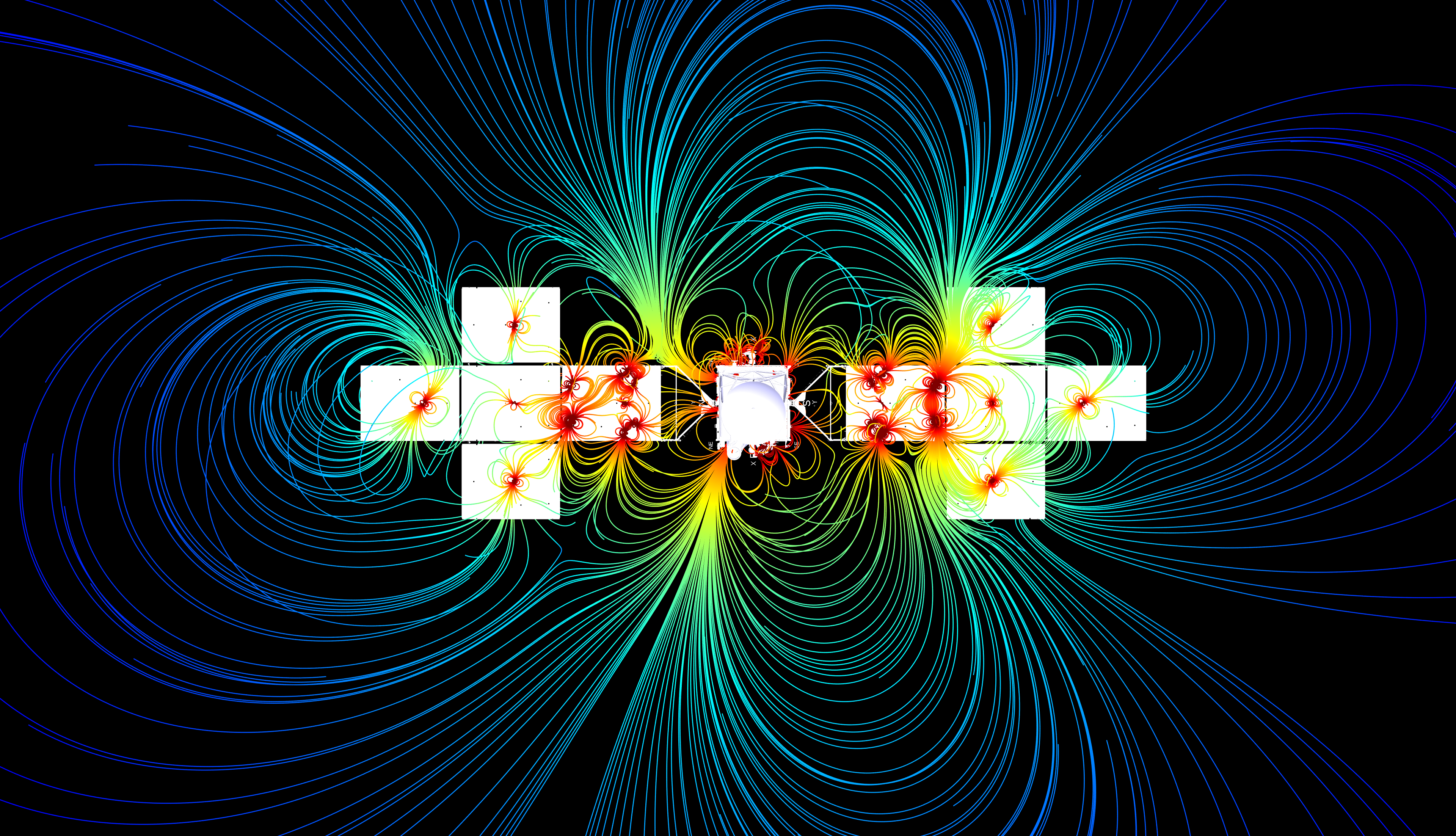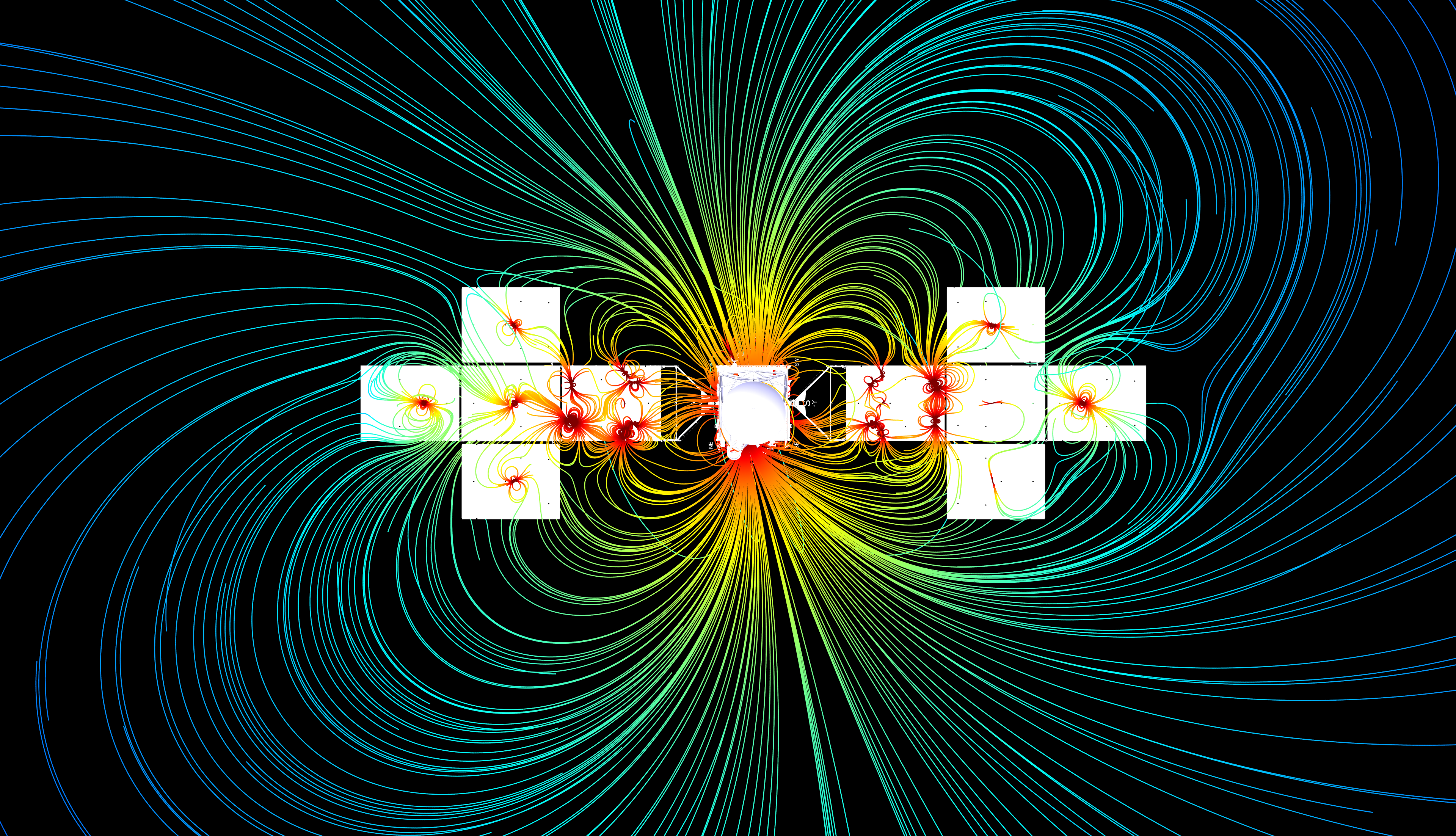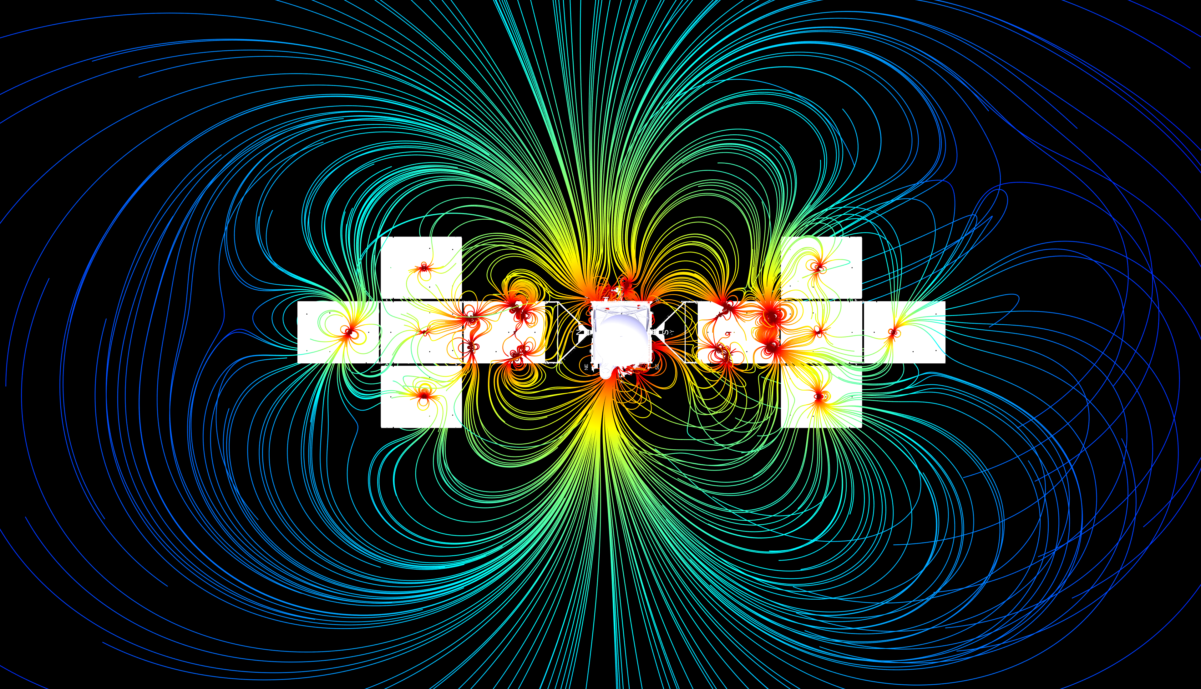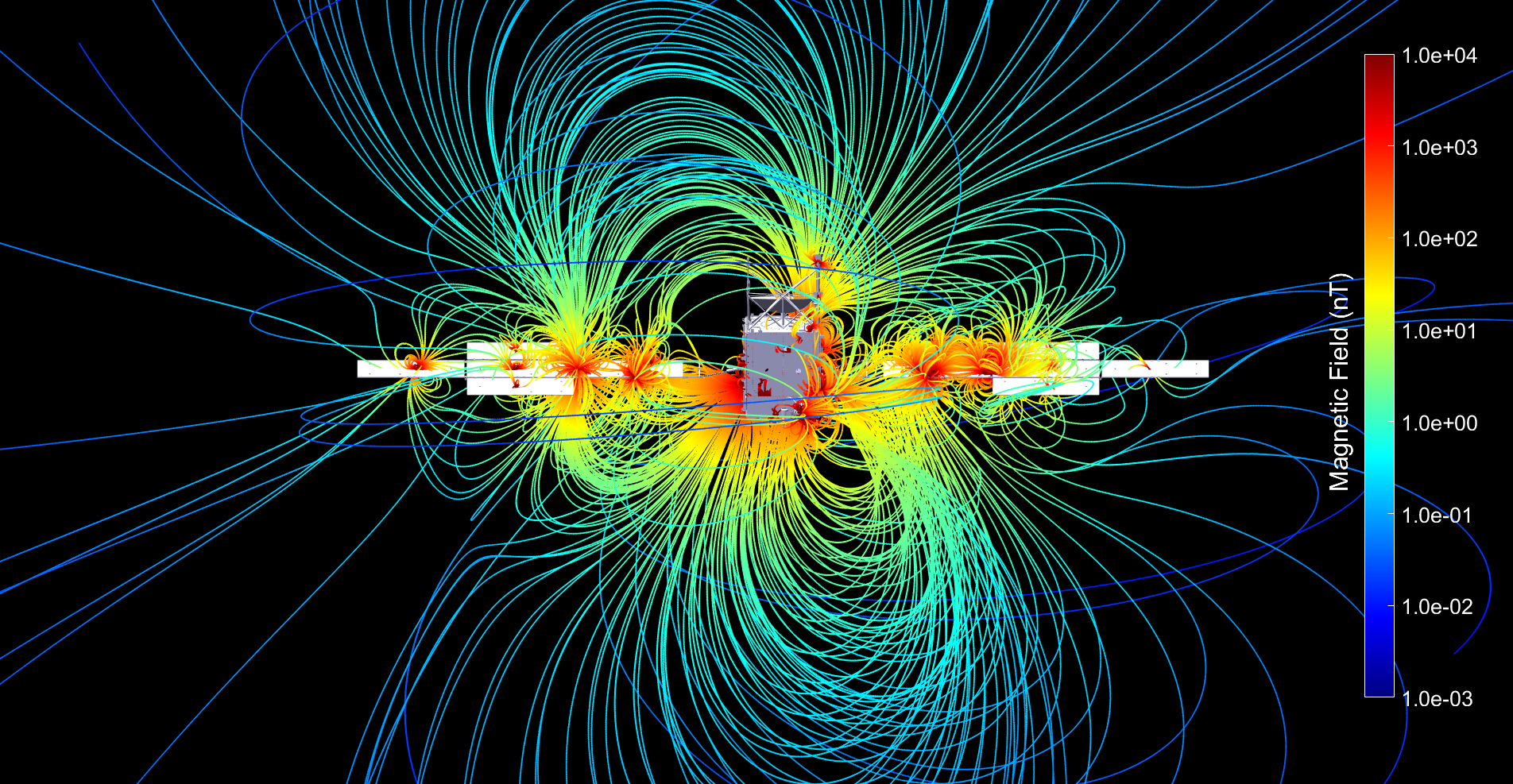 Magnetic sources include hard magnets as well as current loops that generate variable magnetic fields in the two solar array wings which extend outward from the spacecraft. Magnetic field lines that originate from these sources are spatially color-coded by their strength, where red colors indicate higher field strengths and blue colors indicate lower strengths.