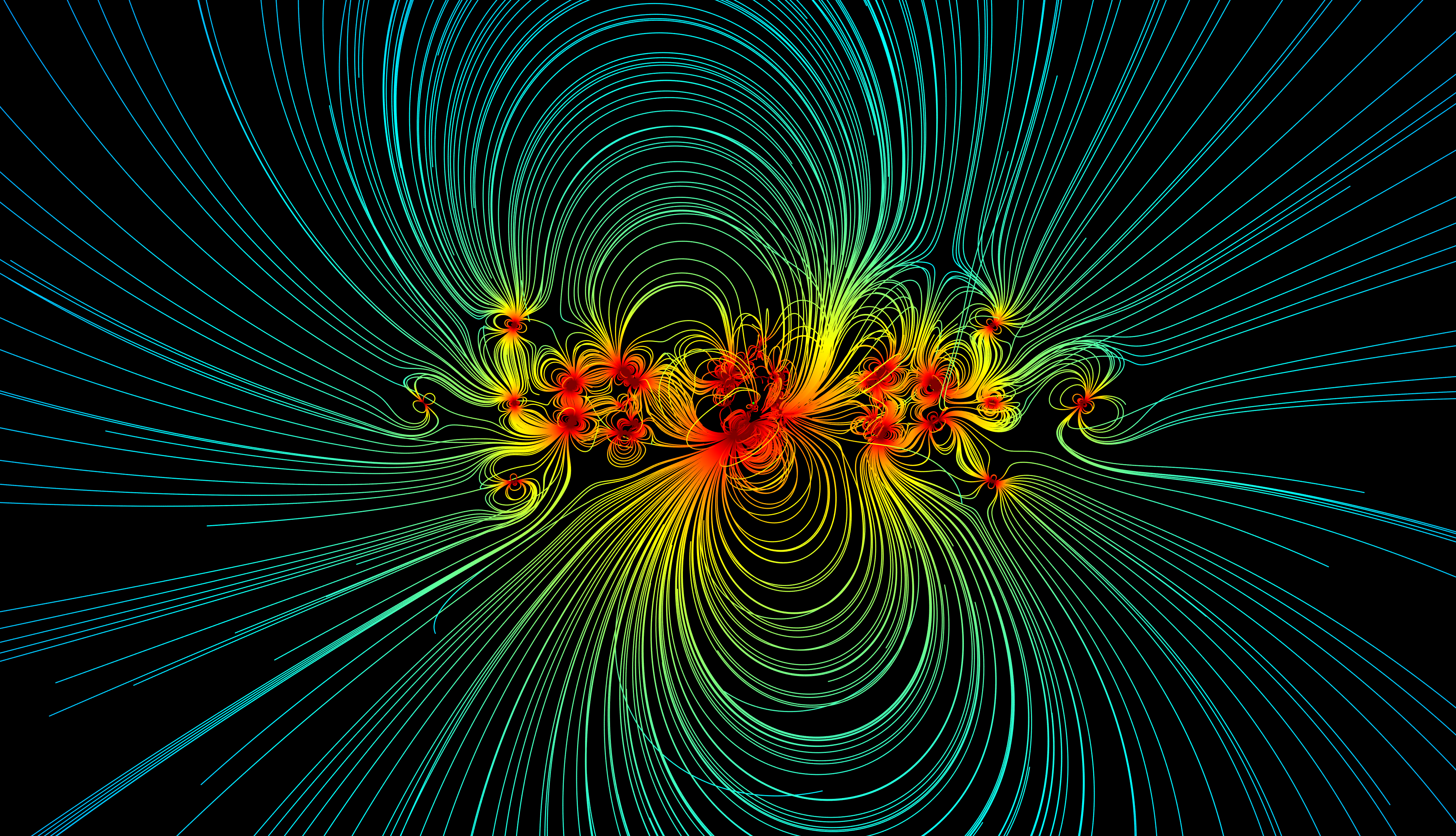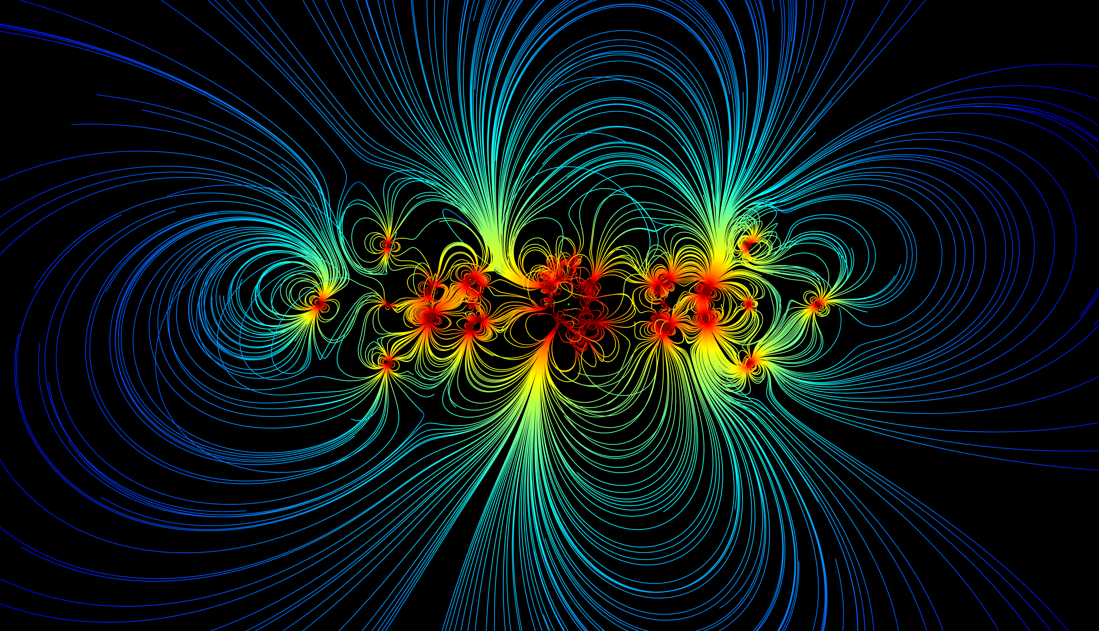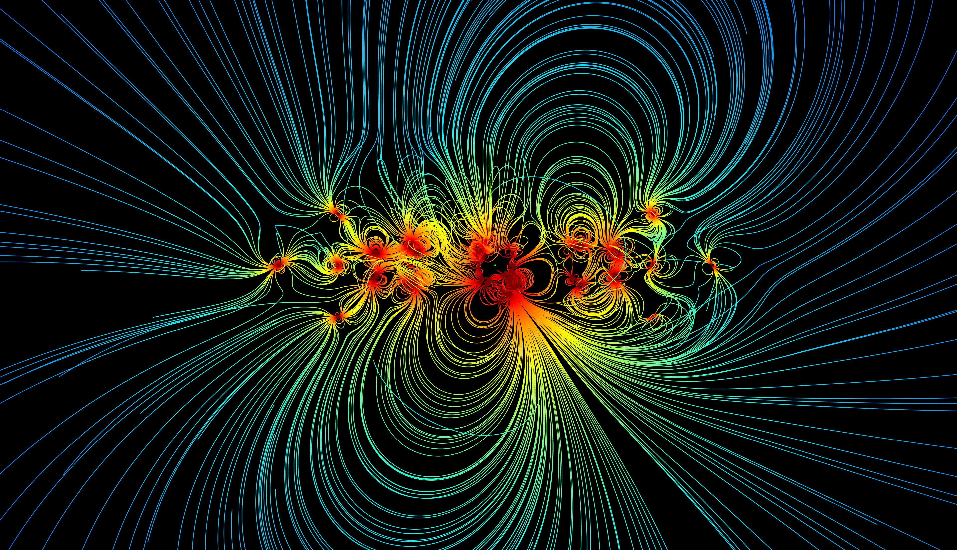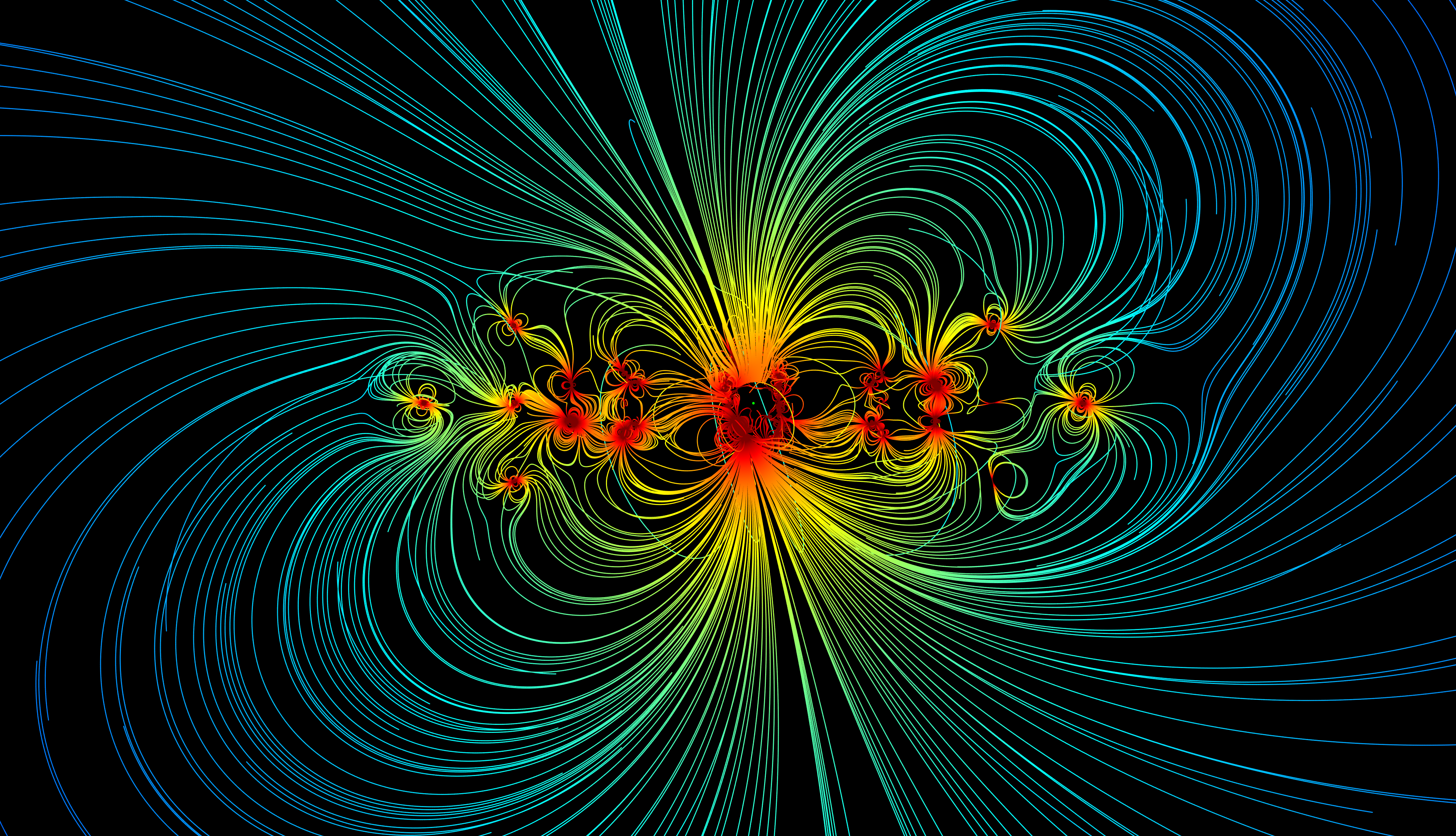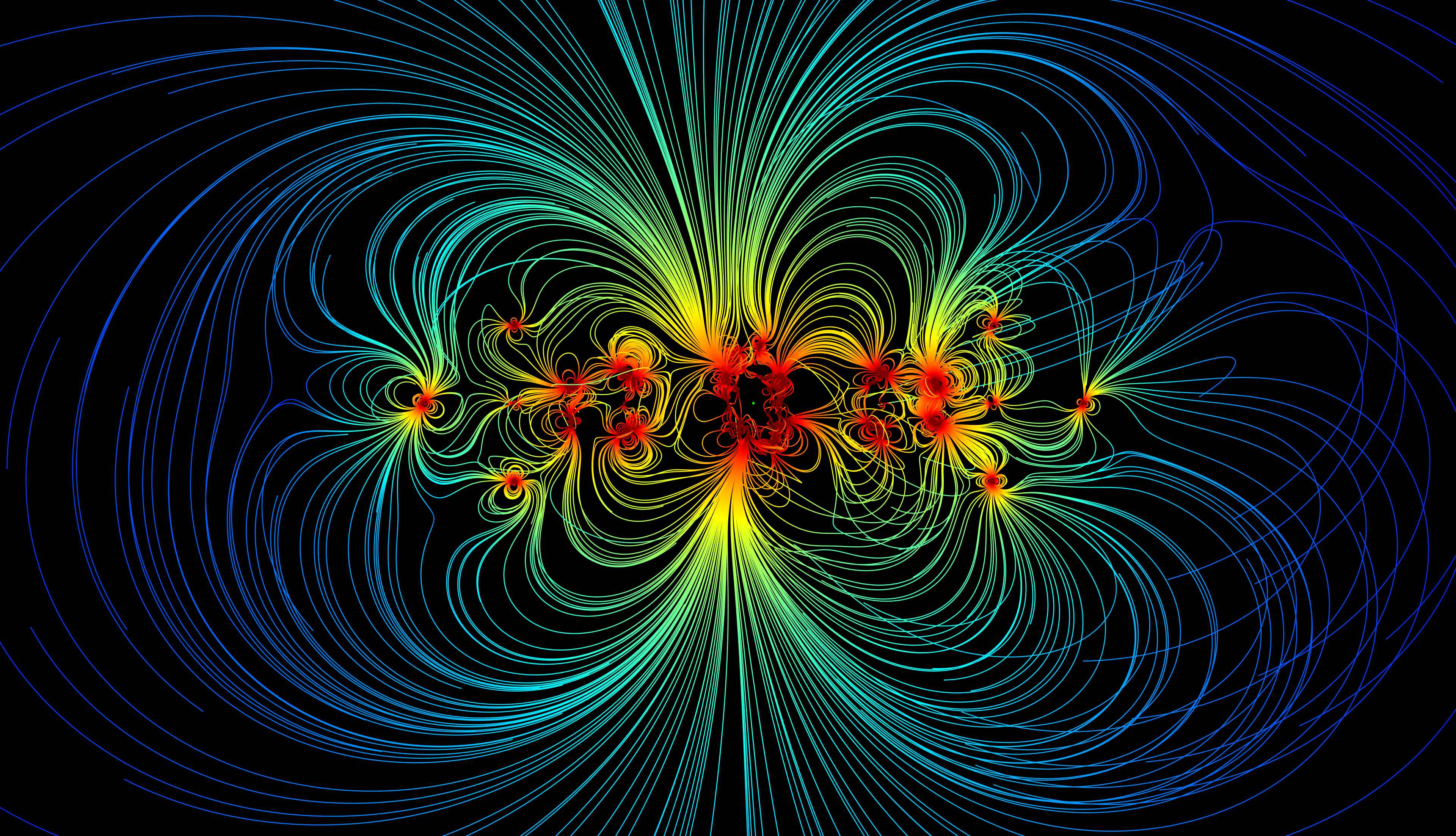 Magnetic sources include hard magnets as well as current loops that generate variable magnetic fields in the two solar array wings which extend outward from the spacecraft. Magnetic field lines that originate from these sources are spatially color-coded by their strength, where red colors indicate higher field strengths and blue colors indicate lower strengths.