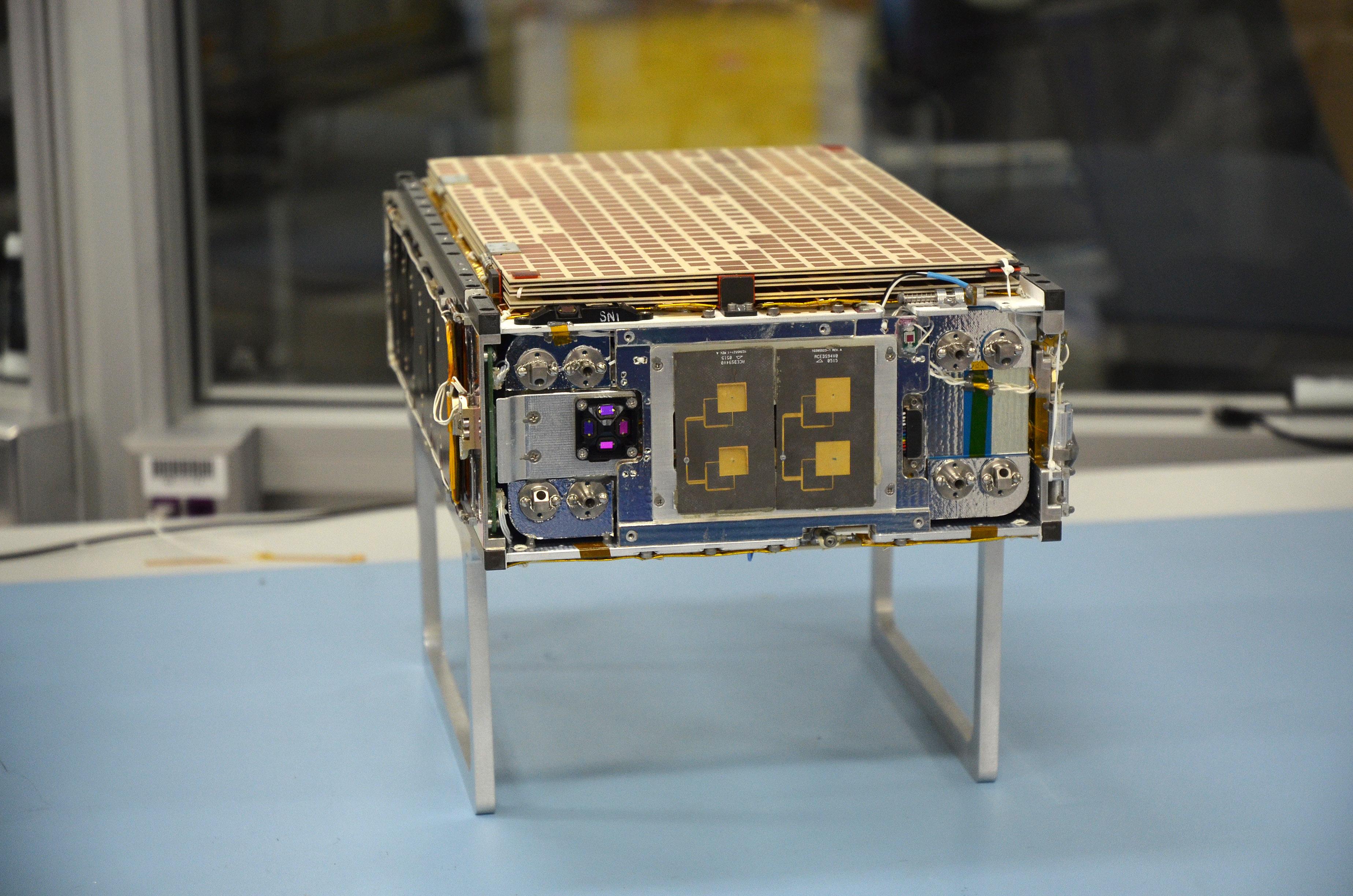 One of the two MarCO (Mars Cube One) CubeSat spacecraft is seen at NASA's Jet Propulsion Laboratory, Pasadena, California.