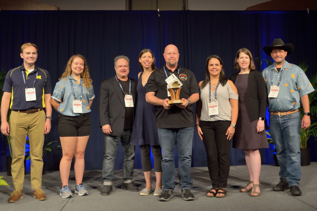JPL engineer Glen Elliott (center) holds the 2019 Small Satellite Mission of the Year Award alongside others who supported the MarCO mission. Left to right: Matthew Szczerba, Kate Parkinson, Ben Malphrus, Kerri Cahoy, Glen Elliott, Chloe Hart, Emily Clements and John Belardo.
