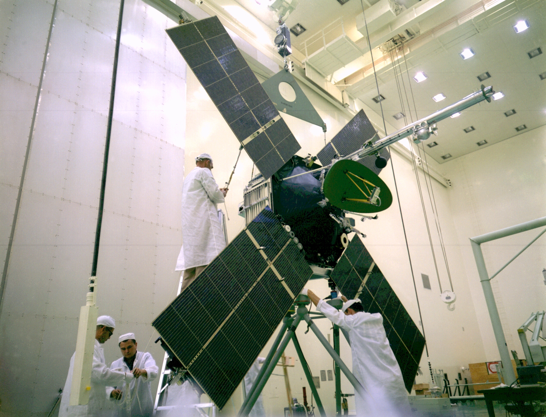 The Mariner 4 spacecraft was assembled by engineers and technicians at the Jet Propulsion Laboratory in Pasadena, California. It is seen here being prepared for a weight test on Nov. 1, 1963.