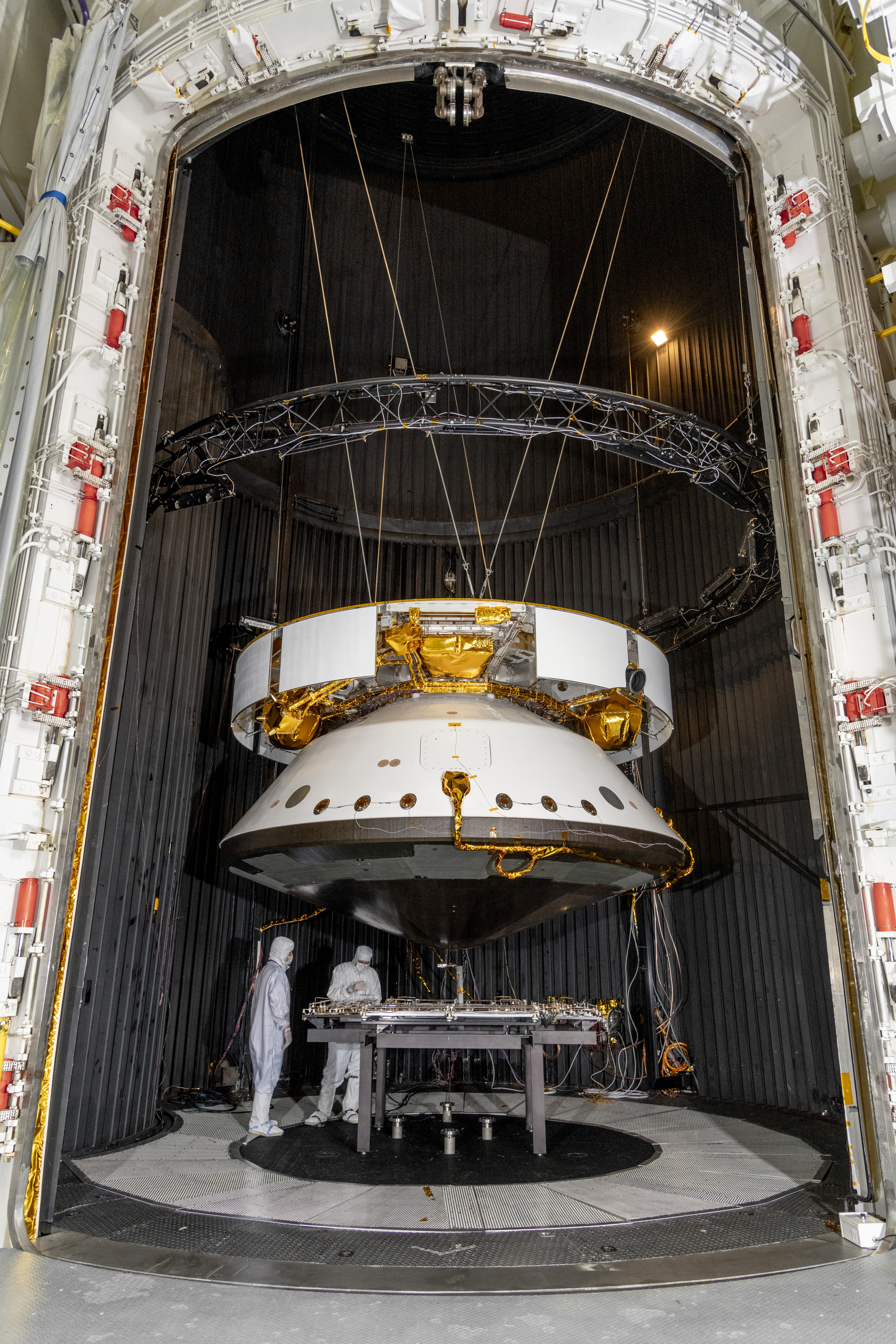 Engineers prepare the Mars 2020 spacecraft for a thermal vacuum (TVAC) test in the Space Simulator Facility at NASA's Jet Propulsion Laboratory in Pasadena, California.