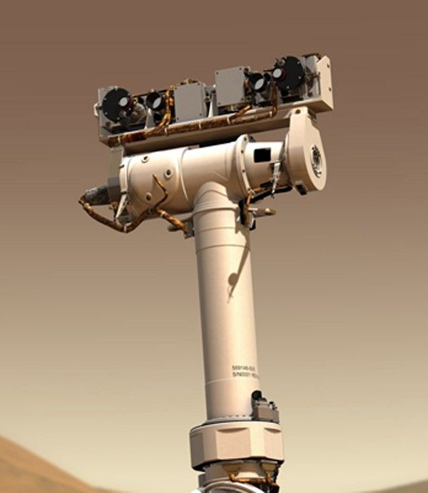 What looks like the rover "neck and head" is called the Pancam Mast Assembly. It stands from the base of the rover wheel 1.4 meters tall (about 5 feet). This height gives the cameras a special "human geologist´s" perspective and wide field of view. The pancam mast assembly acts as a periscope for the Mini-TES science instrument that is housed inside the rover body for thermal reasons and provides a better point of view for the Pancams and the Navcams.