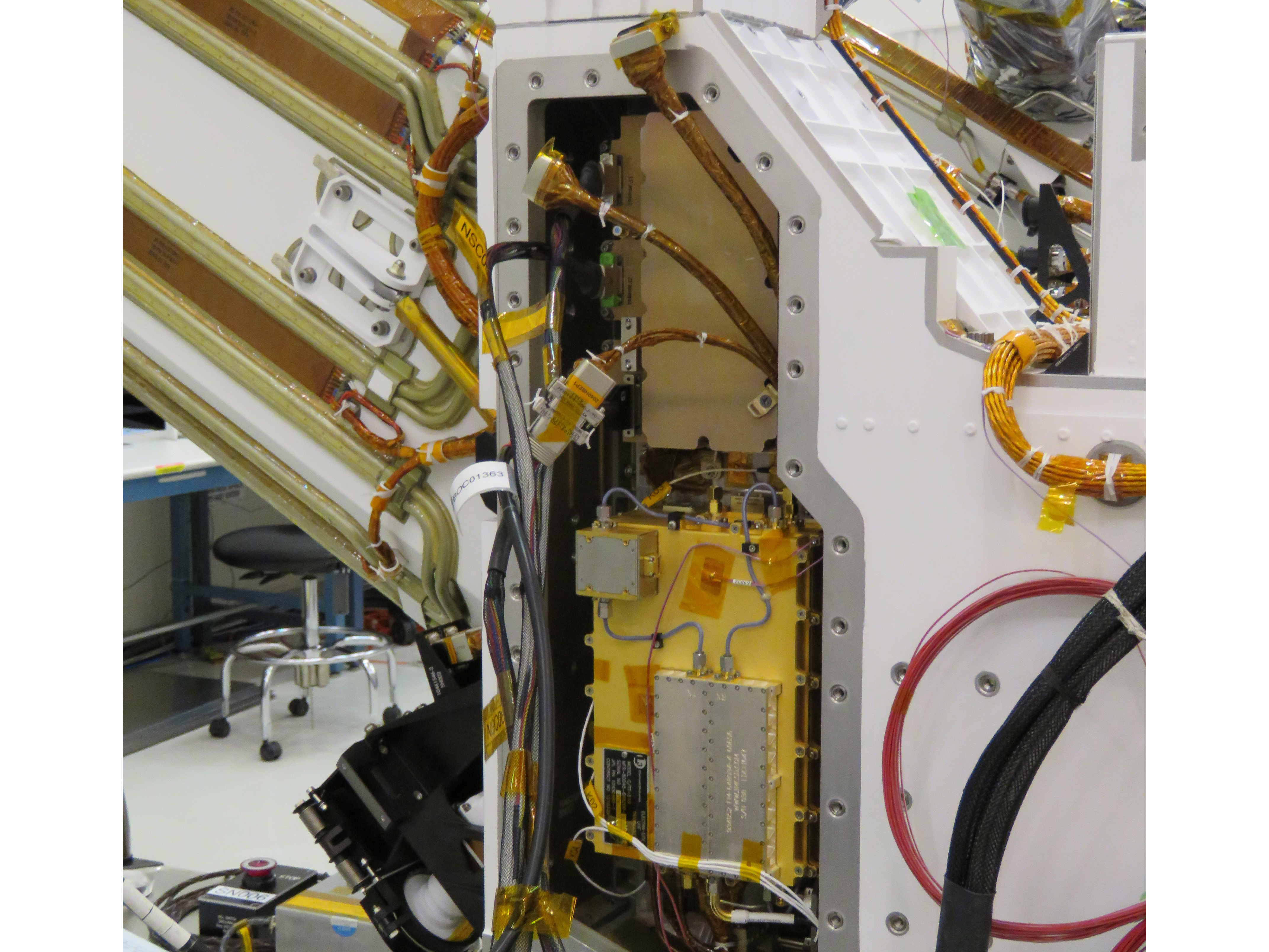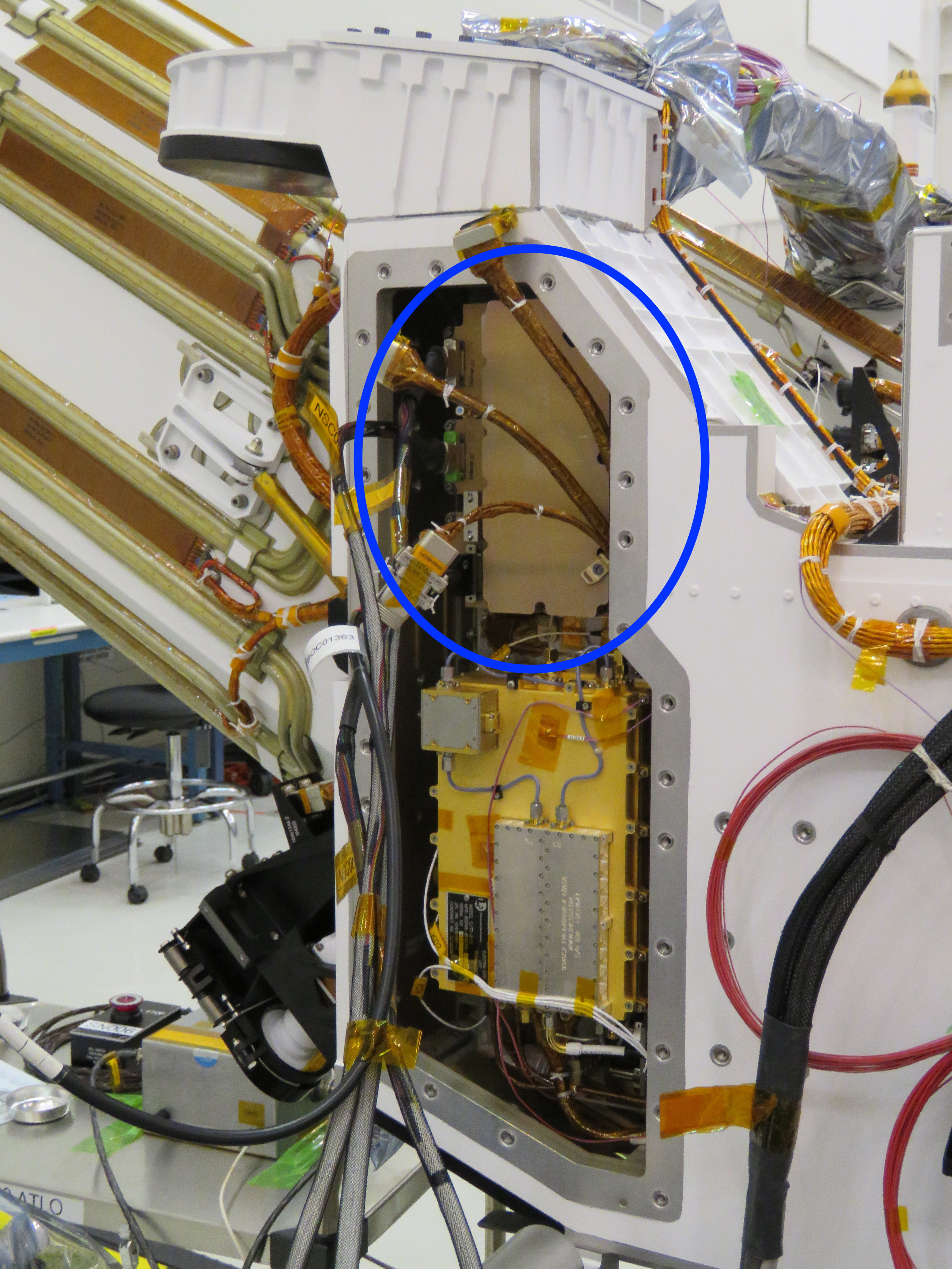 The Mars Helicopter Base Station, seen here as the upper, gold-colored box near the back of NASA’s Perseverance rover, stores and routes communications between NASA’s Ingenuity Mars Helicopter and mission controllers on Earth. (An annotated version of the image circles the base station in blue.)