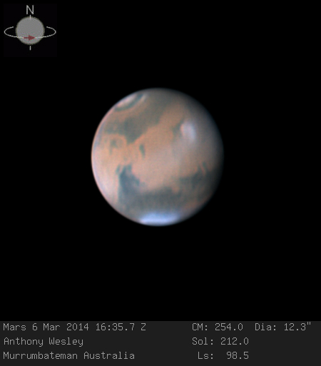 Mars, photographed on March 6, 2014, by Australian amateur astronomer Anthony Wesley using a 16-inch telescope