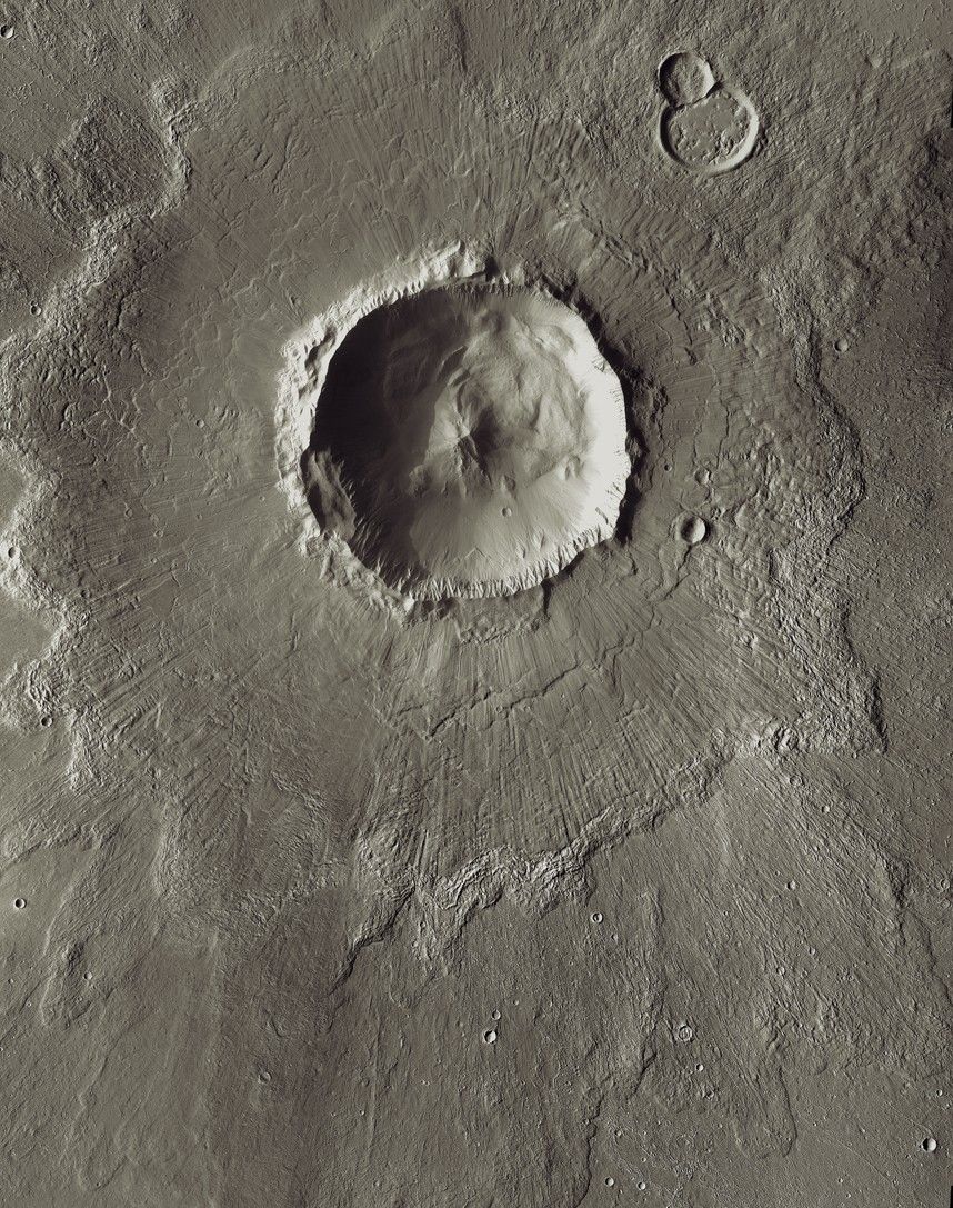 Bacolor Crater is a magnificent impact feature about 20 kilometers (12 miles) wide. The lines on the ejecta blanket surrounding the crater rim come from a surge of superheated gas and debris flying outward in the wake of the meteorite impact that made the crater.