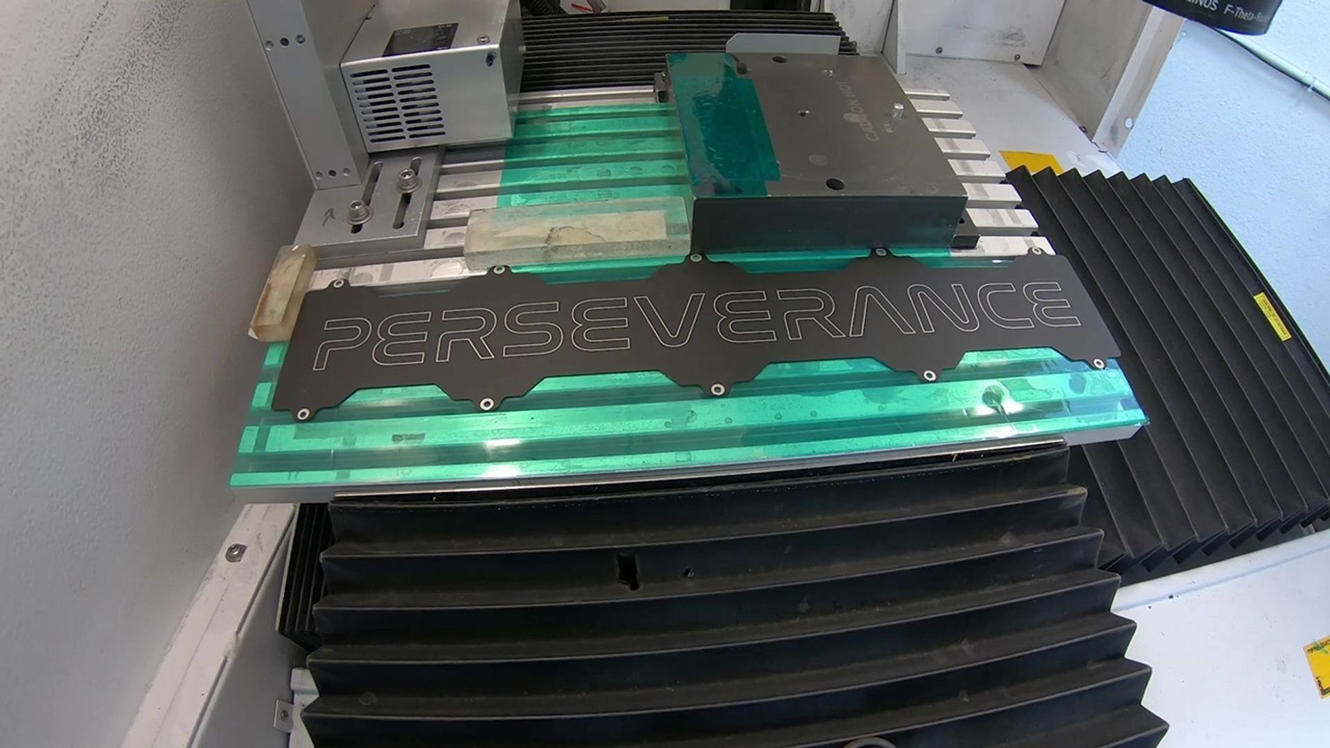 The plate was cut using a waterjet, and the surface was coated with black thermal paint before a computer-guided laser generated the name "Perseverance" by ablating paint from the surface. (The video below shows the process, speeded up 3,000 times.) The nameplate was attached to the rover on March 4, 2020.