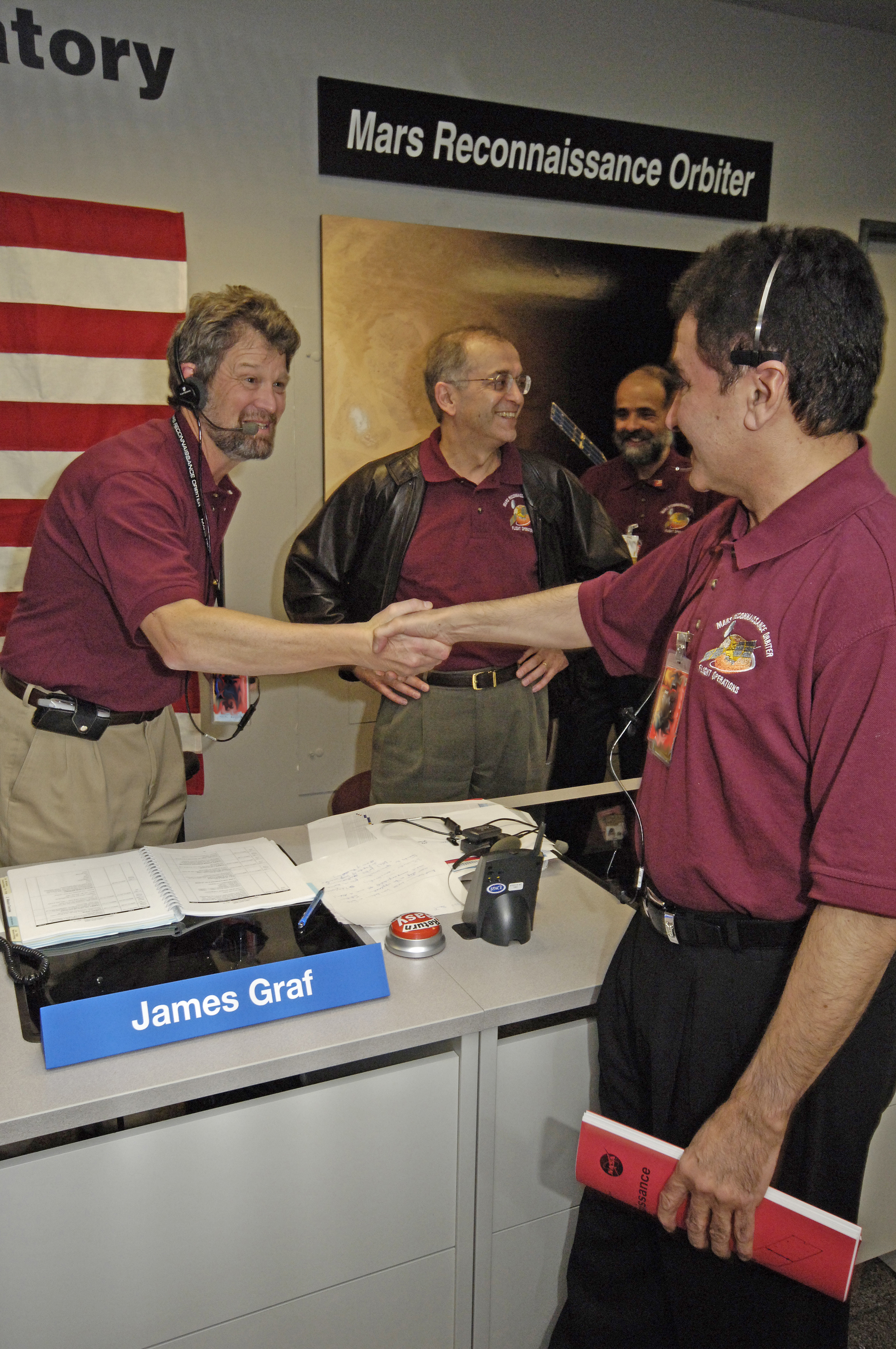 Mars Reconnaissance Orbiter Project Manager Jim Graf shakes the hand of JPL Associate Director for Programs, Project Formulation and Strategy Dr. Firouz Naderi. They are celebrating the spacecraft's successful orbit insertion.