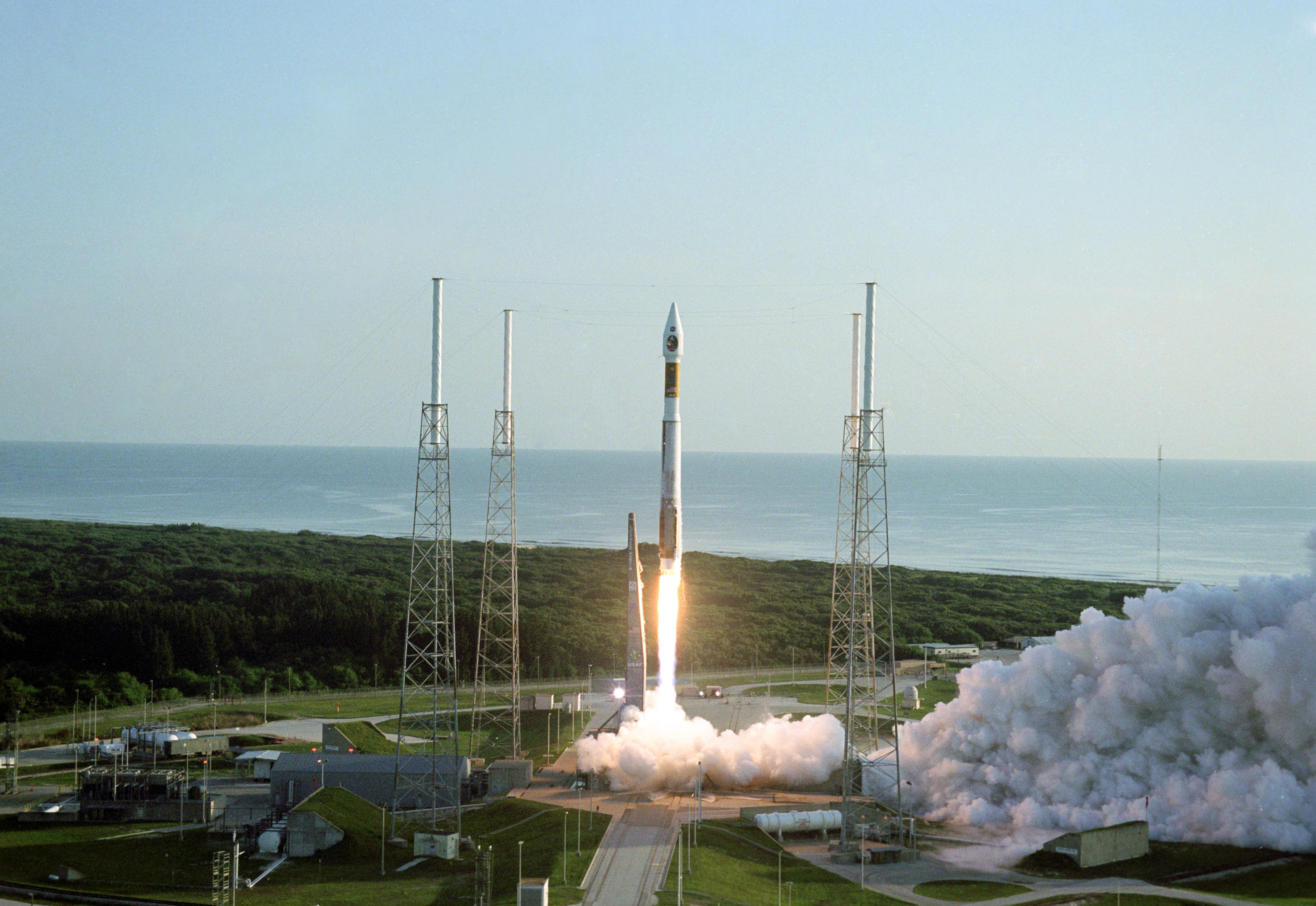 With the Atlantic Ocean as a backdrop, an Atlas V launch vehicle, 19 stories tall, with a two-ton Mars Reconnaissance Orbiter on top, roars away from Launch Complex 41 at Cape Canaveral Air Force Station at 7:43 a.m. EDT on Aug. 12, 2005.