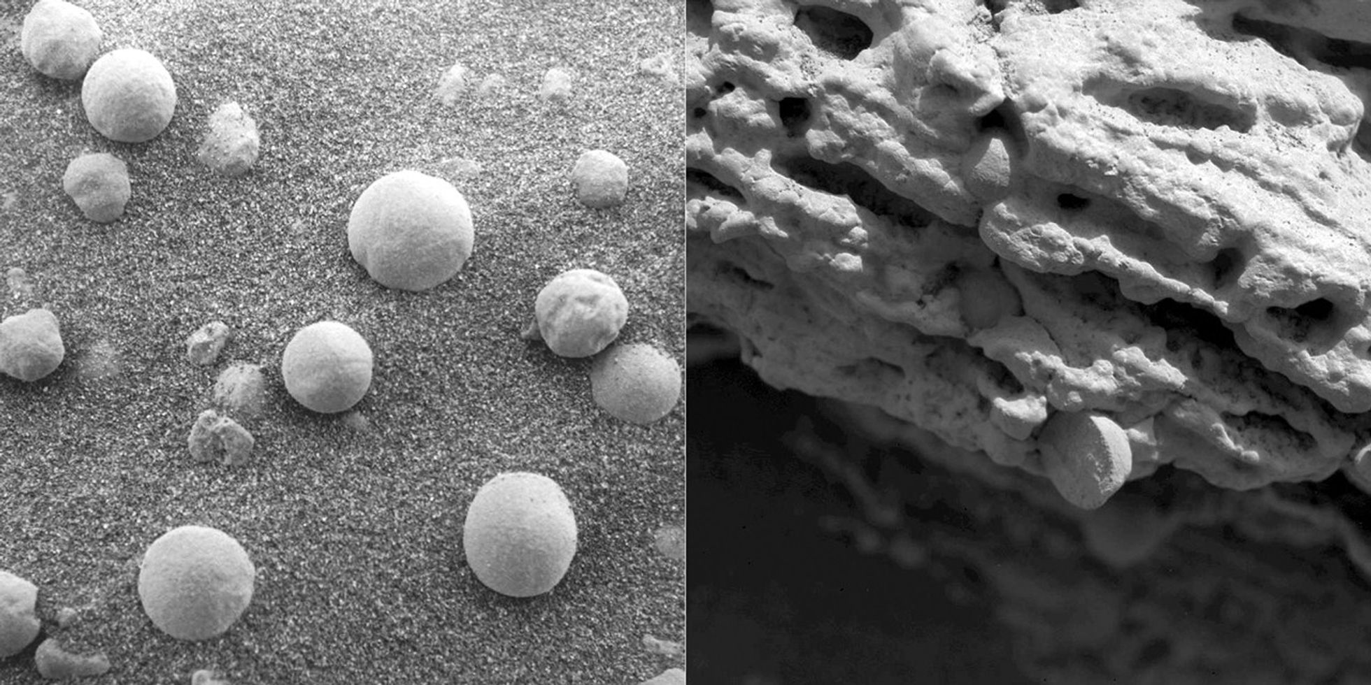 The left image shows an extreme close-up of round, blueberry-shaped formations in the martian soil near a part of the rock outcrop at Meridiani Planum called Stone Mountain.