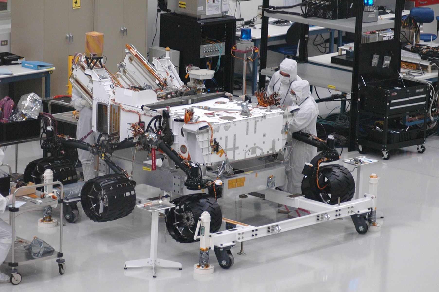 Spacecraft engineers and technicians are assembling and testing the rover in a large clean room at NASA's Jet Propulsion Laboratory, Pasadena, Calif.