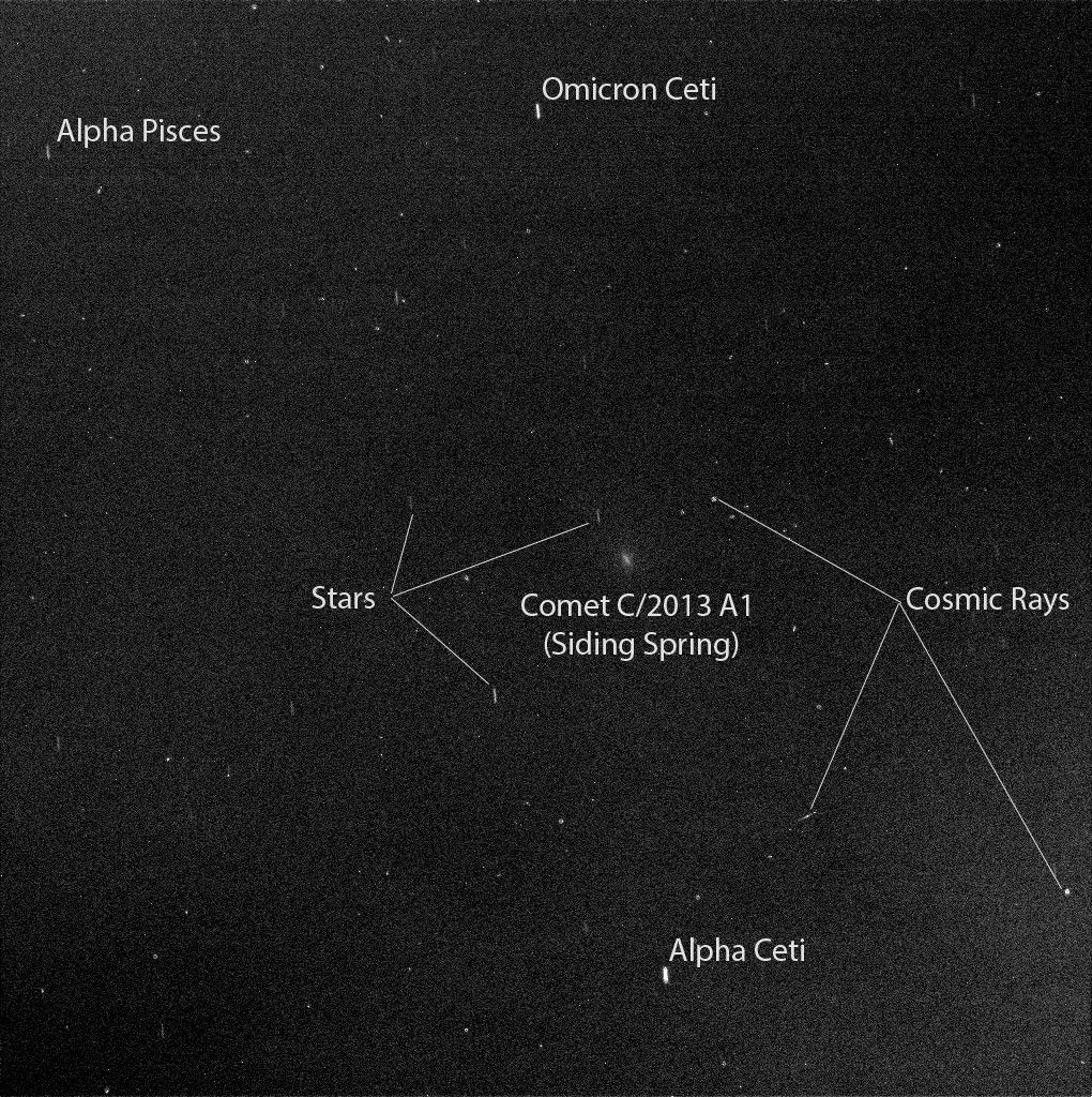 The comet, some nearby stars, and some effects of cosmic rays hitting the camera's light detector are labeled. View the unannotated version of the image.