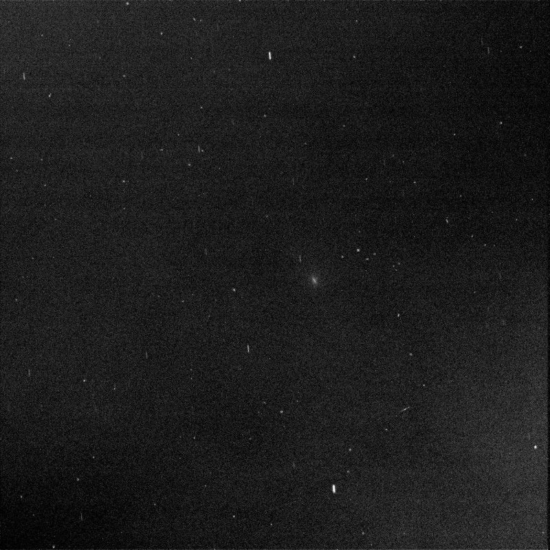 The image has been processed by removal of detector artifacts and slight twilight glow. The duration of the exposure resulted in a 12.5-pixel smear from rotation of Mars. The smear for the comet is at a slightly different angle from the others, due to the comet's own motion across the sky.