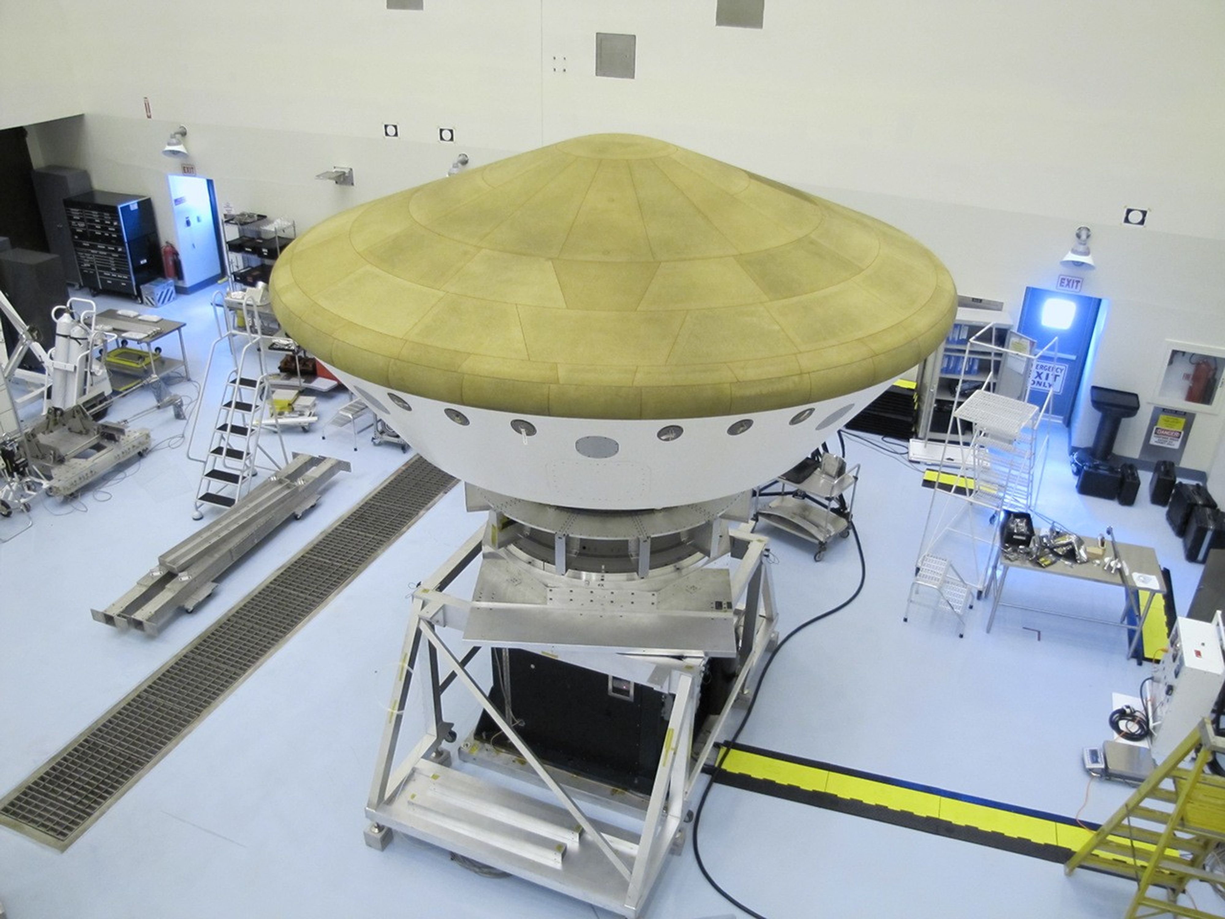 This image, taken Oct. 1, 2011, shows the aeroshell with its heat shield on top.