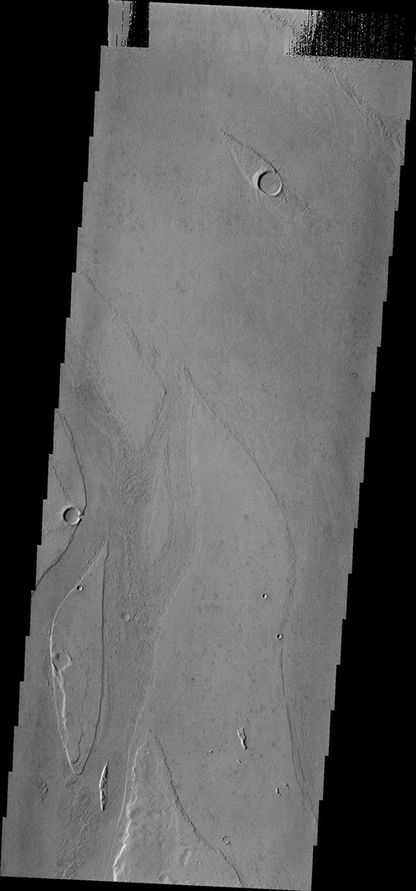 Marte Vallis, located in Amazonis Planitia, is broad and shallow. The streamlined islands at the top and bottom of the image illustrate this.