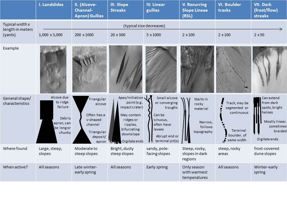 As on the Earth, many processes can move material down a Martian slope. This graphic compares seven different types of features observed on Mars that appear to result from material flowing or sliding or rolling down slopes.