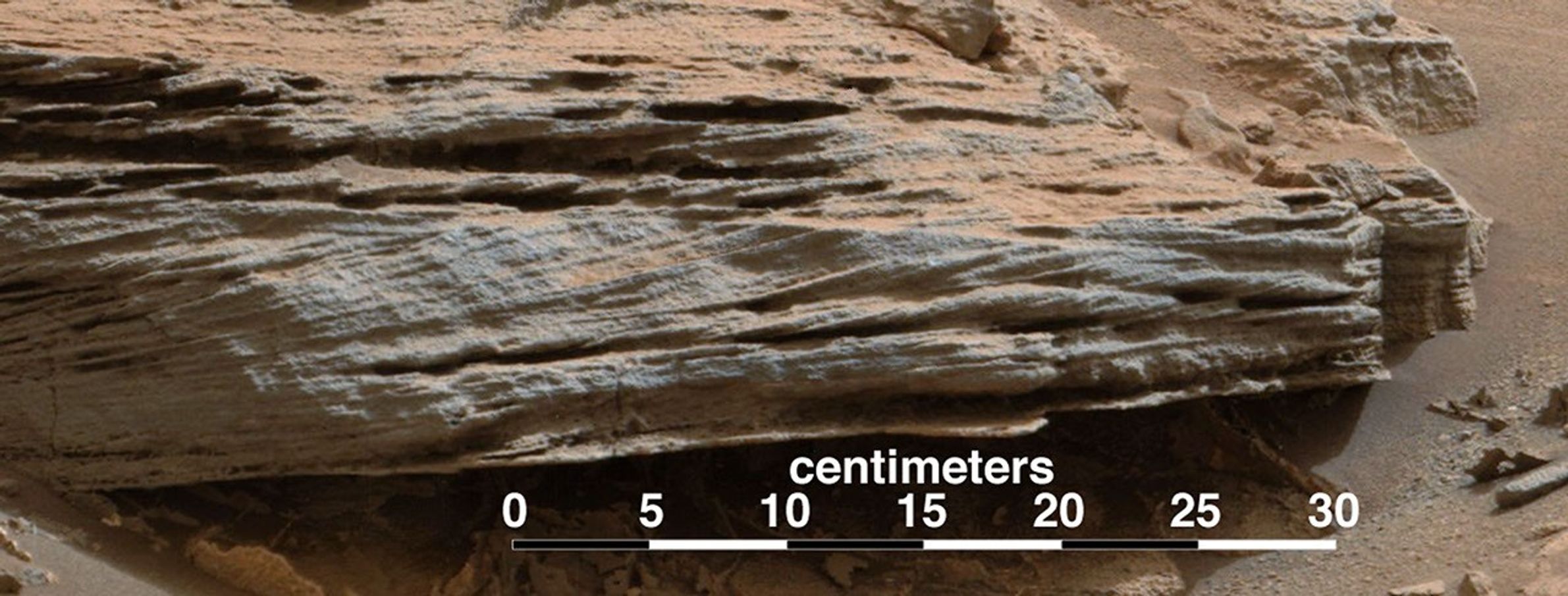 The color has been approximately white-balanced to resemble how the scene would appear under daytime lighting conditions on Earth. Figure A is a cropped version with a superimposed scale bar of 30 centimeters (about 12 inches) just beneath cross-bedding, which is evident in the layers at angles to each other.