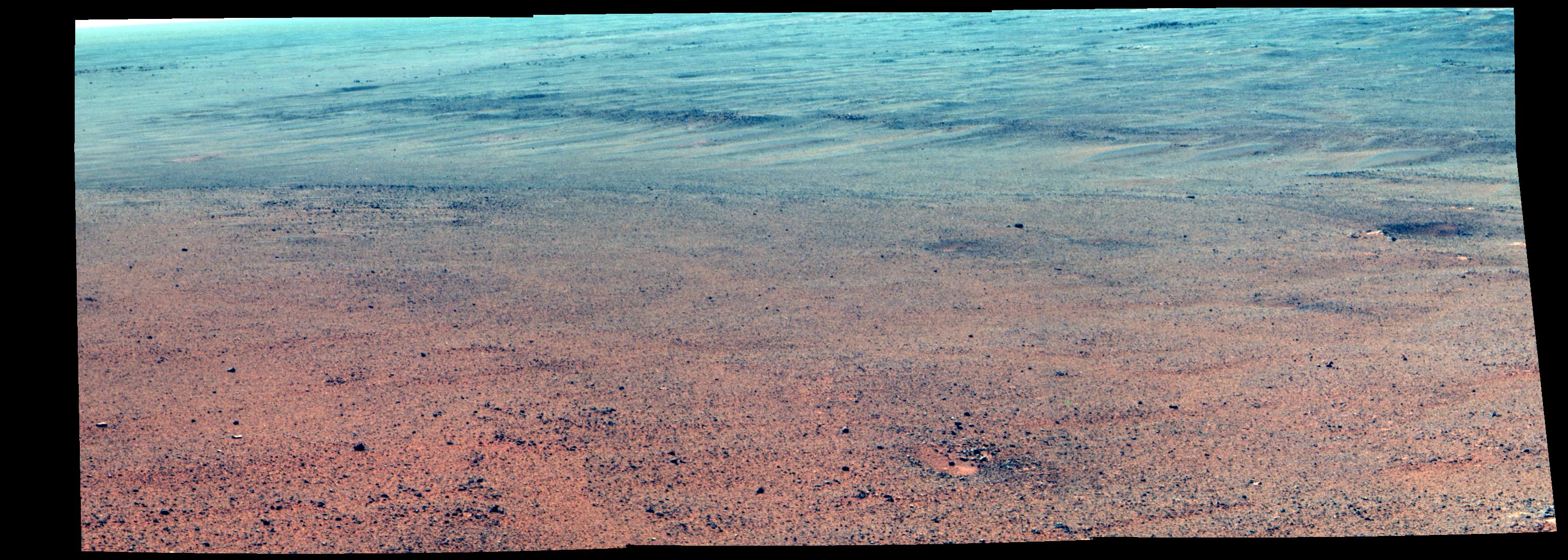 NASA's Mars Exploration Rover Opportunity took the component images of this enhanced-color scene during the mission's "walkabout" survey of an area just above the top of "Perseverance Valley," in preparation for driving down the valley.