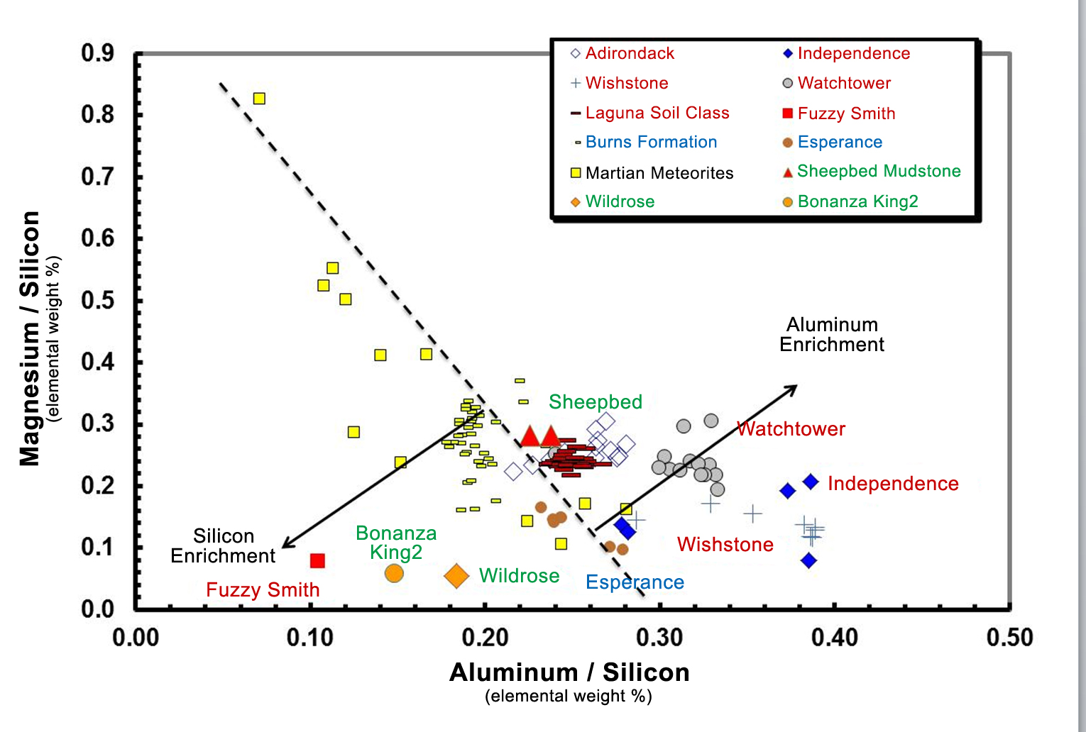 Data from the Alpha Particle X-ray Spectrometer (APXS) instrument on NASA's Mars rover Curiosity show an unusual enrichment of silicon in the rocks dubbed "Wildrose" and "Bonanza King," relative to other rocks studied at Gale Crater on Mars, where the rover landed. This same enrichment had been seen by earlier missions to Mars (labeled in red), and even in Mars meteorites (black). The Bonanza King rock is most similar to "Fuzzy Smith" in silicon abundance. Fuzzy Smith, studied by the rover Spirit at Gusev Crater, indicated a past aqueous environment.