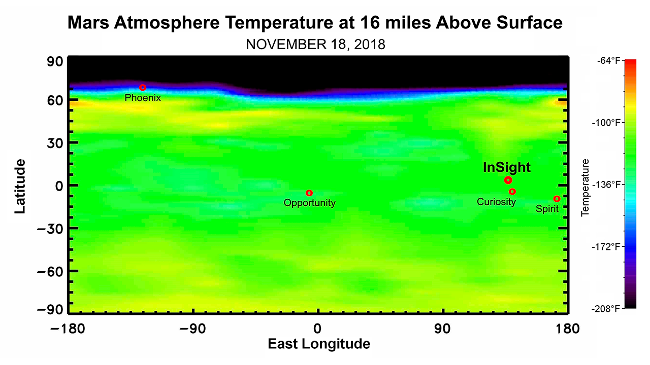 This map shows the temperature of the Martian atmosphere 16 miles above the surface. The data were taken on Nov. 18, 2018, by NASA’s Mars Reconnaissance Orbiter, about one week before NASA's InSight lander is scheduled to touch down on the Martian surface. The temperature indicates to mission scientists the amount of dust activity in the atmosphere. The map shows a range of latitudes, with temperatures clearly dropping near the planet's north pole. The landing locations of various NASA Mars landers are shown for context.