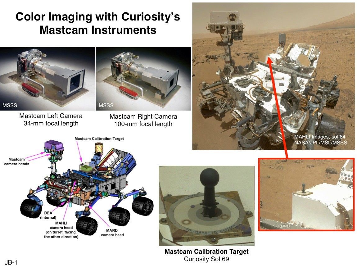 This set of images illustrates the twin cameras of the Mast Camera (Mastcam) instrument on NASA's Curiosity Mars rover (upper left), the Mastcam calibration target (lower center), and the locations of the cameras and target on the rover. The known colors of materials on the calibration target aid researchers in adjusting images to estimate "natural" color, or approximately what the colors would look like if we were to view the scene ourselves on Mars. The design of the target is essentially the same as the color calibration target used for the Pancam instruments on the Mars Exploration Rovers Spirit and Opportunity. For Curiosity, the target was modified to include six small embedded magnets that can capture and concentrate dust from the Martian atmosphere. These are the reddish rings seen in the image of the target shown here, which was taken on Sol 69 of Curiosity's mission on Mars (Oct. 15, 2012).