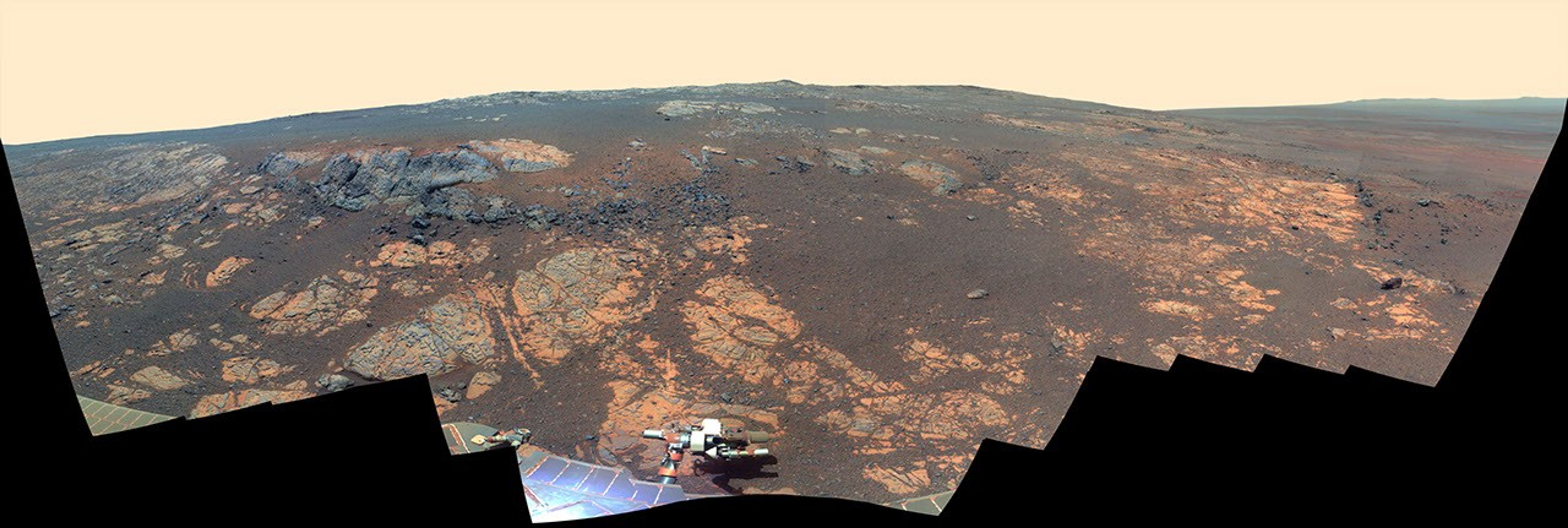 Matijevic Hill is an area within the "Cape York" segment of Endeavour's rim where clay minerals have been detected from orbit. This view is centered northwestward, toward the crest of Cape York. It extends more than 210 degrees from left to right. The field of view encompasses most of the terrain traversed by Opportunity during a "walkabout" in October and November 2012 to scout which features to spend time examining more intensely. Two of the features investigated at Matijevic Hill are "Copper Cliff," the dark outcrop in the left center of the image, and "Whitewater Lake," the bright outcrop on the far right.