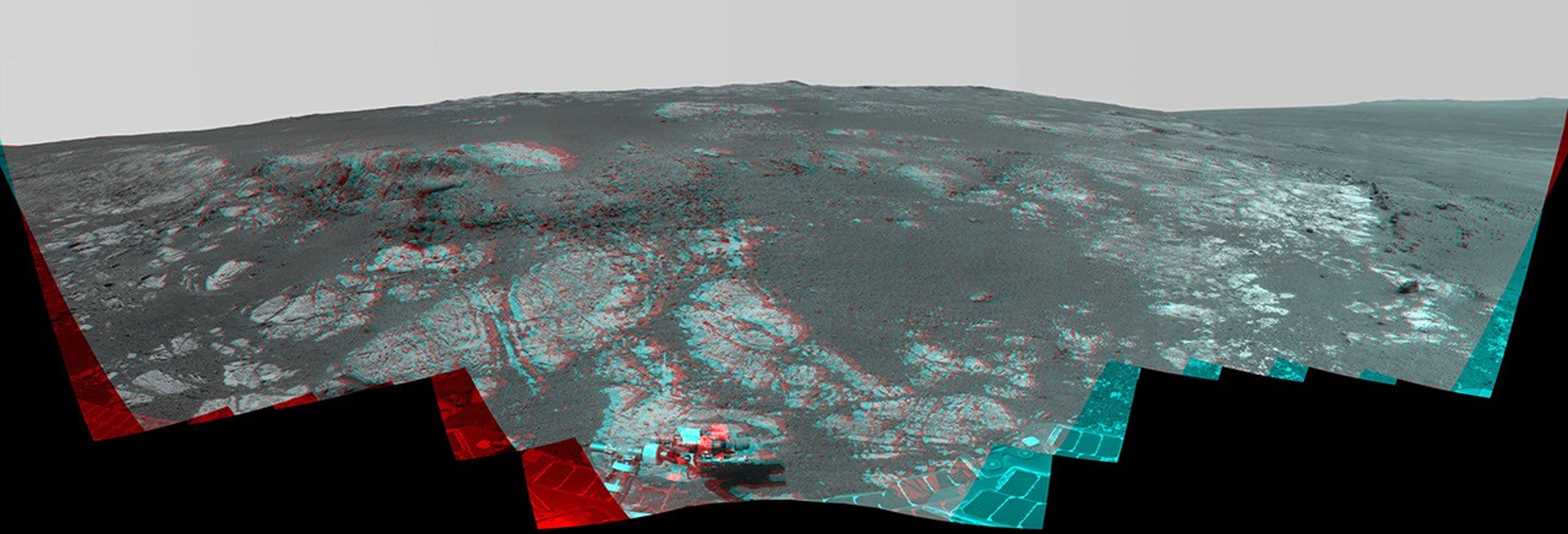 As NASA's Mars Exploration Rover Opportunity neared the ninth anniversary of its landing on Mars, the rover was working in the 'Matijevic Hill' area seen in this stereo view from Opportunity's panoramic camera (Pancam). The image combines views from the left eye and right eye of the Pancam to appear three-dimensional when seen through blue-red glasses with the red lens on the left.