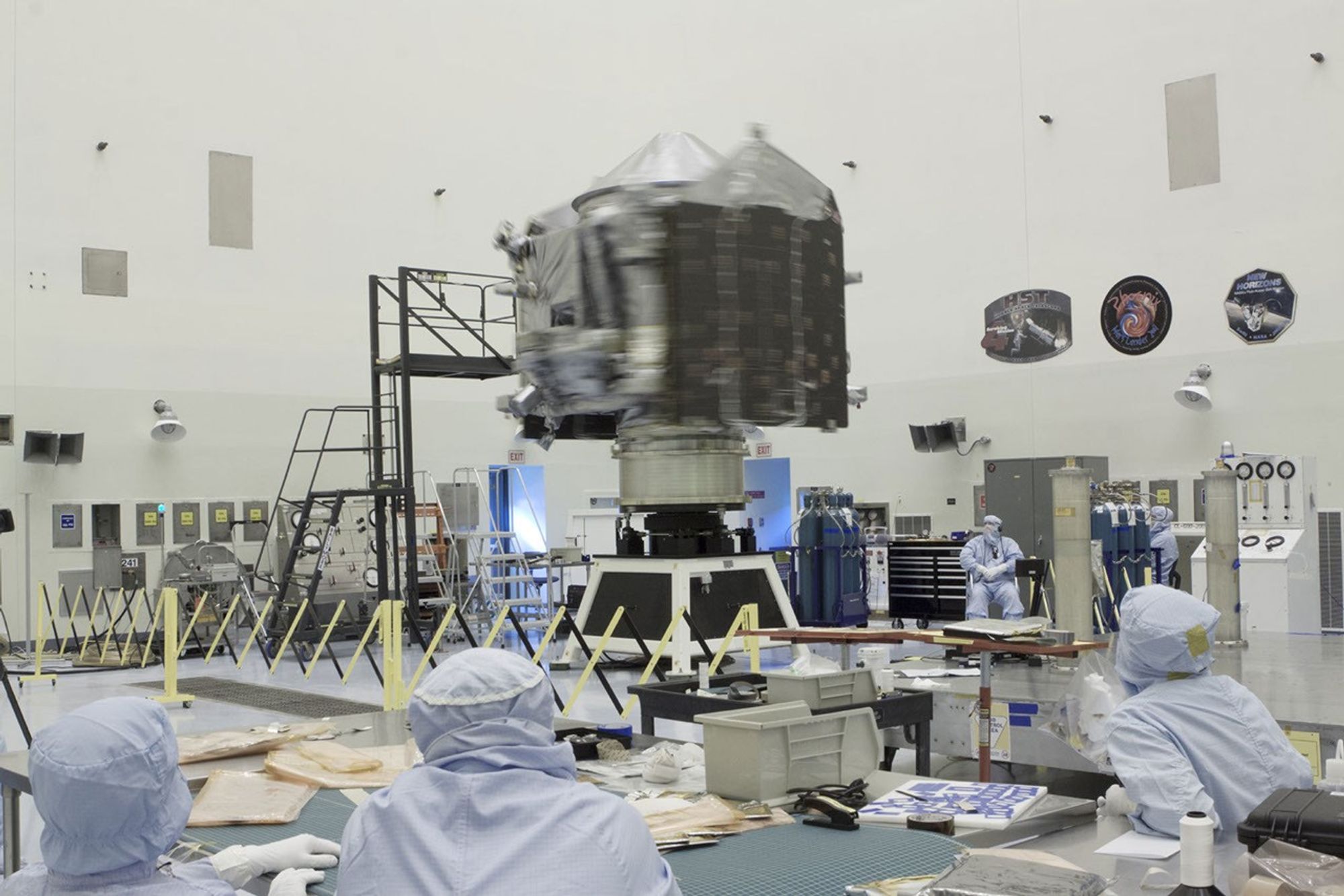 Inside the Payload Hazardous Servicing Facility at NASA's Kennedy Space Center in Florida, engineers and technicians perform a spin test of the Mars Atmosphere and Volatile Evolution, or MAVEN, spacecraft.