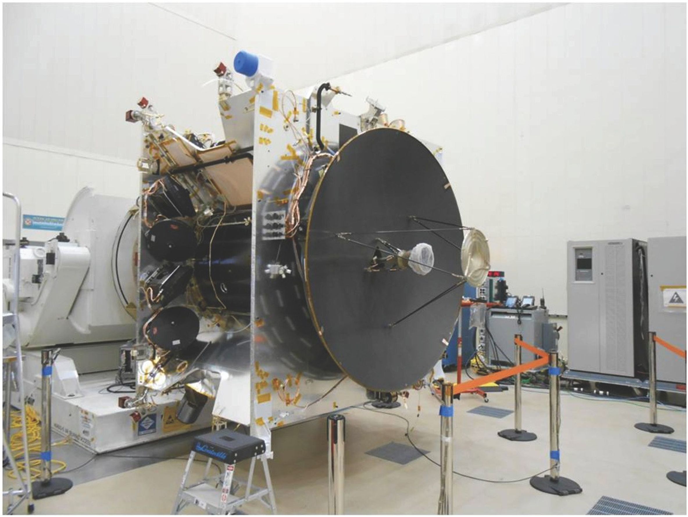 The MAVEN spacecraft in Assembly, Test, and Launch Operations phase at Lockheed Martin. Here, the High Gain Antenna is visible after installation onto the main spacecraft bus.