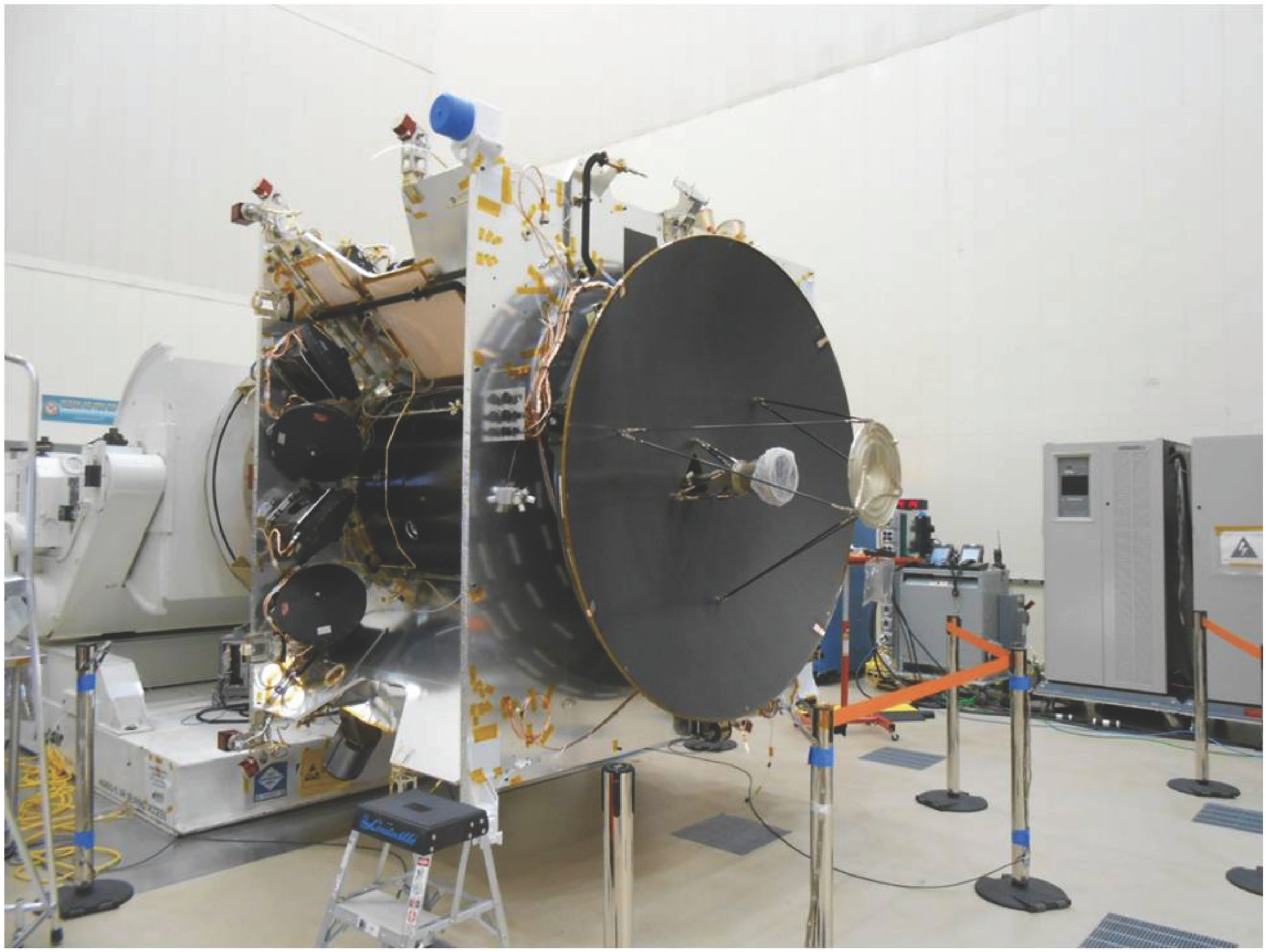 The MAVEN spacecraft in Assembly, Test, and Launch Operations phase at Lockheed Martin. Here, the High Gain Antenna is visible after installation onto the main spacecraft bus.