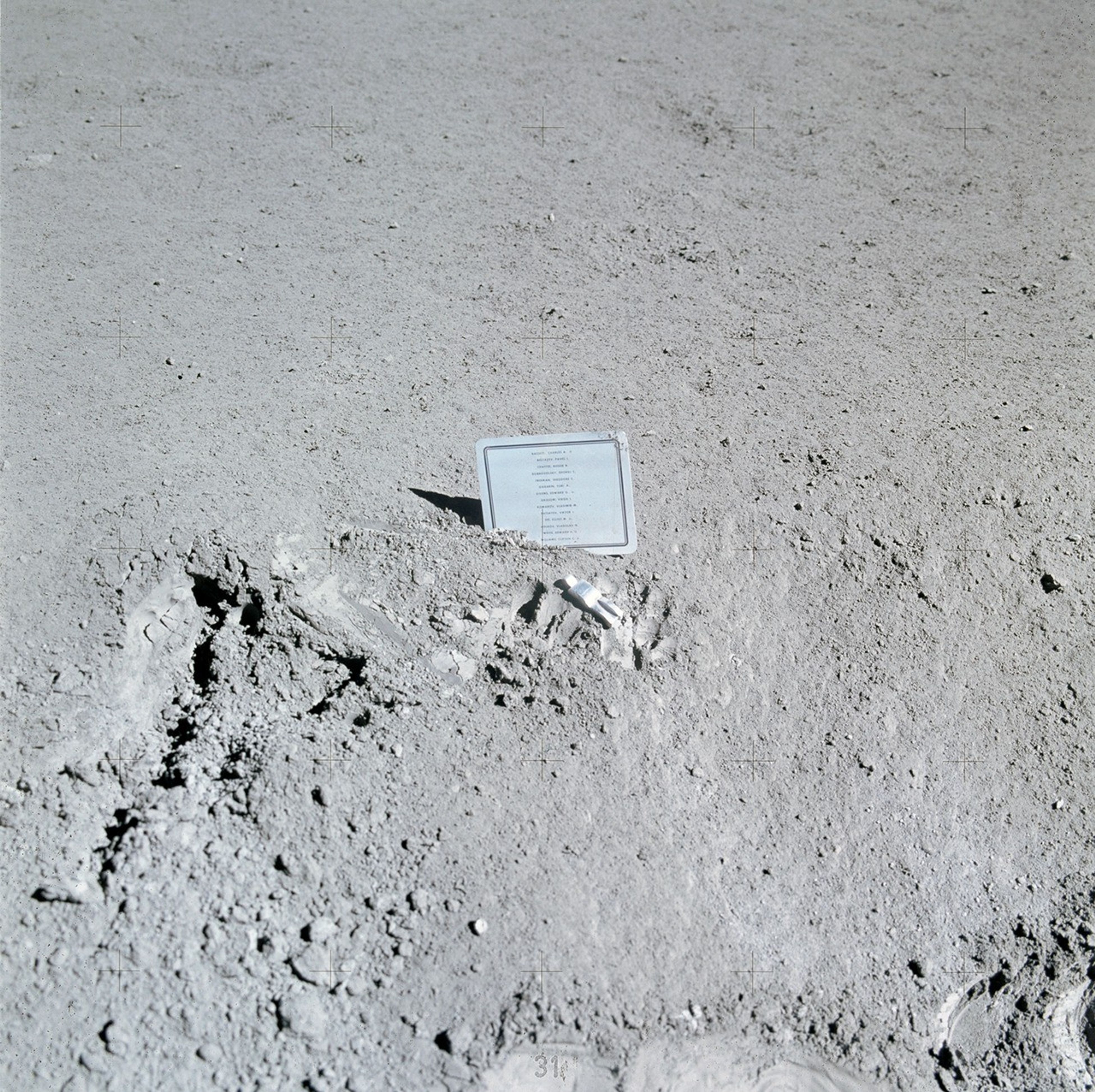 A close-up view of a commemorative plaque left on the Moon at the Hadley-Apennine landing site in memory of 14 NASA astronauts and USSR cosmonauts, now deceased.