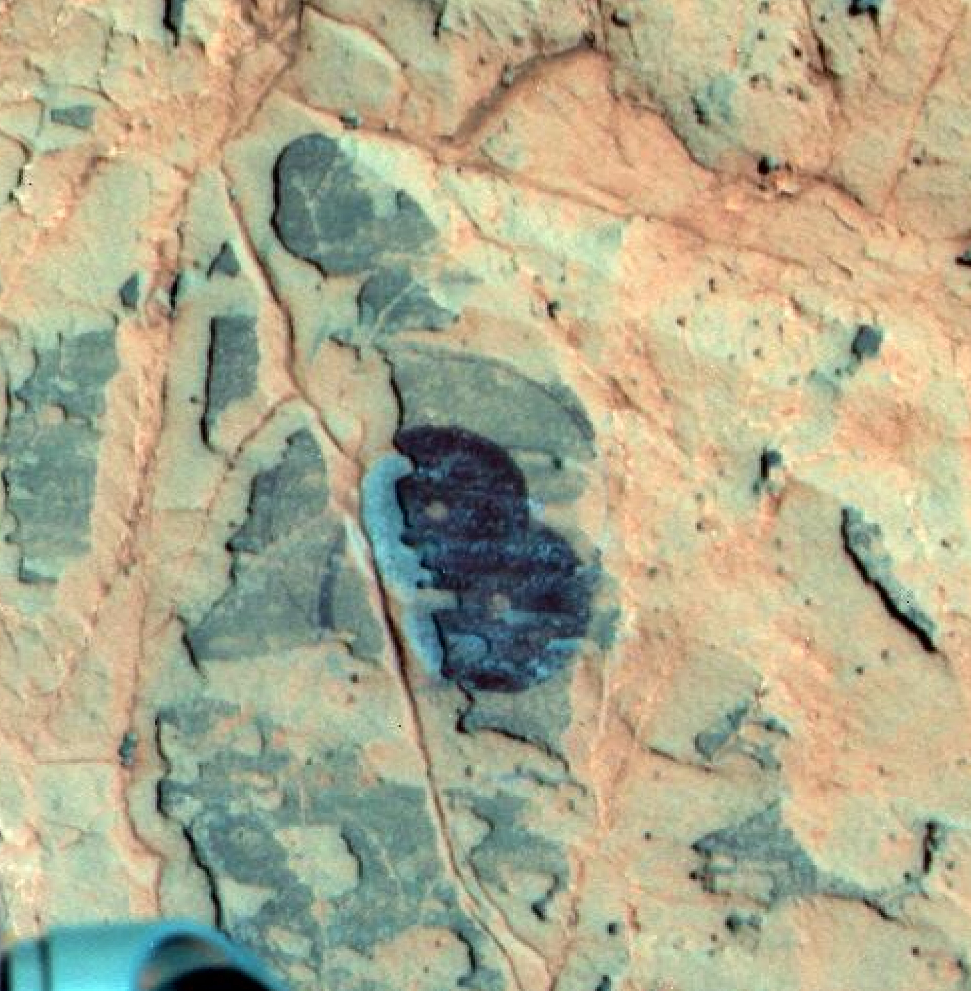 This false-color view from the panoramic camera (Pancam) on Opportunity shows a dark veneer, exposed after brushing with the rover's rock abrasion tool. These finely layered rocks with dark veneers are in the "Whitewater Lake" outcrop on "Matijevic Hill" on the western rim of Endeavour. The deposits are part of the ancient Matijevic formation, which predates the Endeavour impact event. The brushed area is about 1.5 inches (3.8 centimeters) wide. This image was taken on the 3,098th Martian day, or sol, of Opportunity's mission (Oct. 11, 2012).